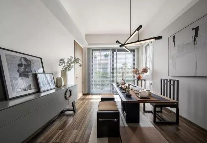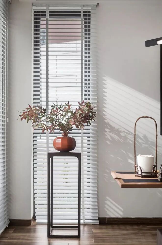 百叶帘作为窗帘的布置,还有禅意端庄的花瓶布置,也都为空间添增了不少情趣雅致的档次感。