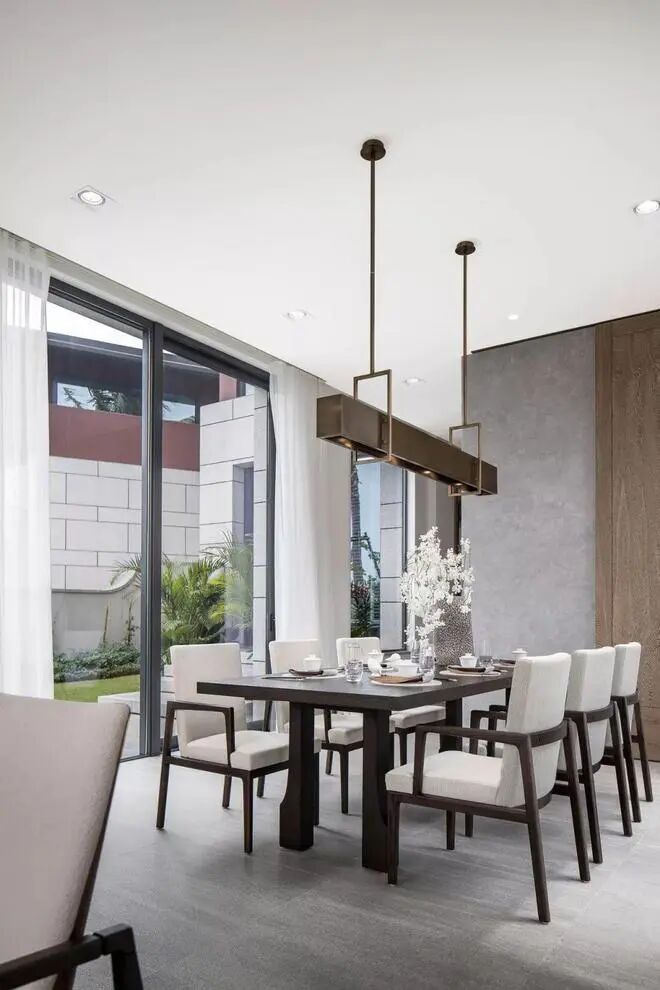 厚实的实木餐桌,搭配布艺坐垫的餐椅,餐桌上华丽精致的餐具鲜花布置,还有一盏大尺寸的金属吊灯,都让用餐氛围显得更加华丽优雅自然。