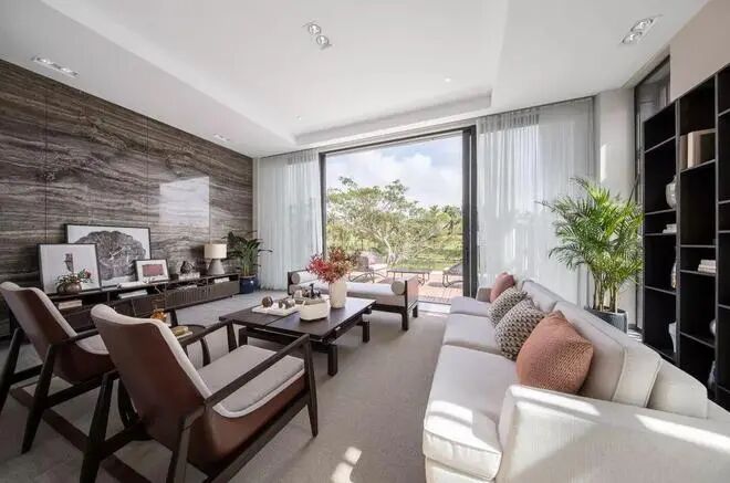 电视墙以灰色调的大理石质感,搭配上米白色布艺沙发,还有现代端庄的新中式风格茶几与沙发椅,营造出一种文雅端庄的高级空间感。