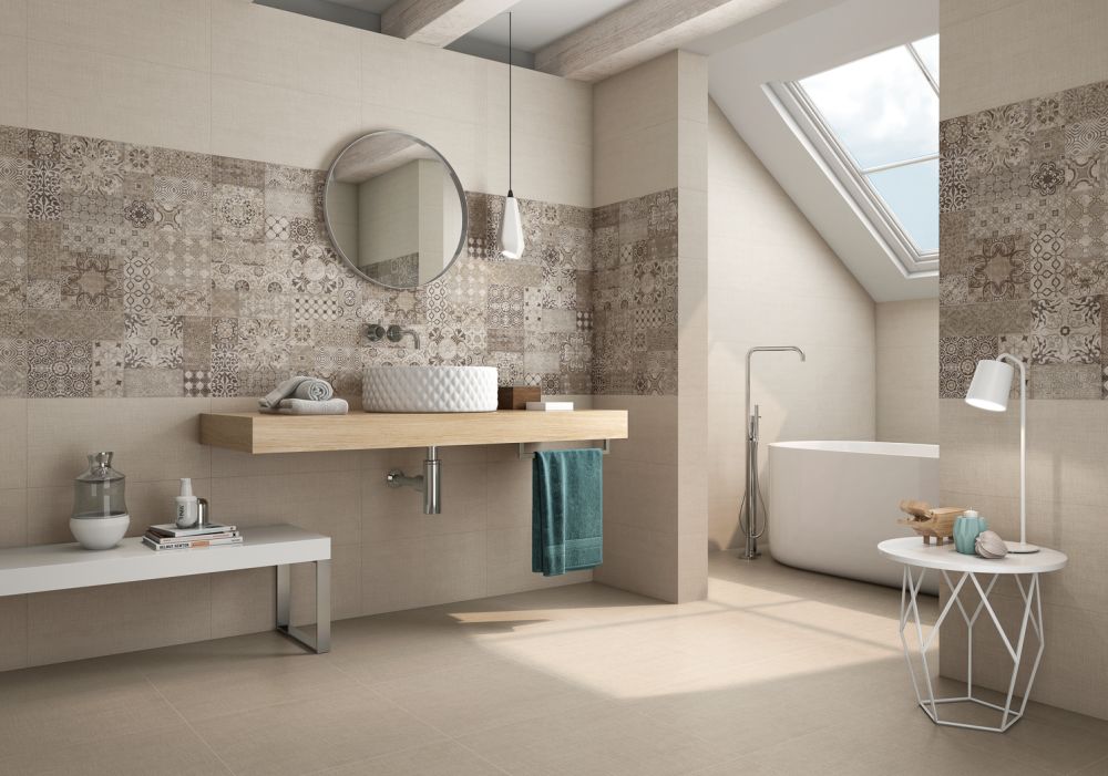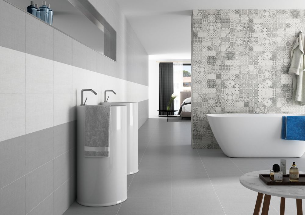 △常见的铺贴方式地砖与墙砖同色,这样在视觉上更加舒适,除此之外,上下分色也是比较常见的铺贴法,为了不显得“头重脚轻”,一般会选择上浅下深的方式,中间会以腰线隔断。