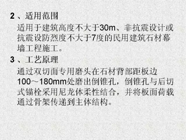 用此工艺做成的饰面,在风力和地震力的作用下允许产生适量的变位,以吸收部分风力和地震力,而不致出现裂纹和脱落。当风力地震力消失后,石材也随结构而复位。