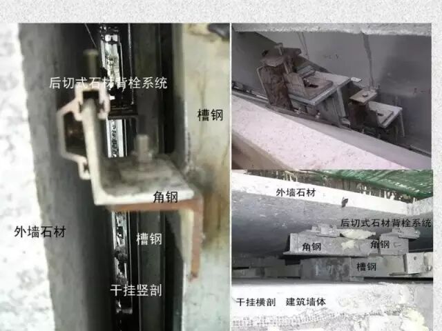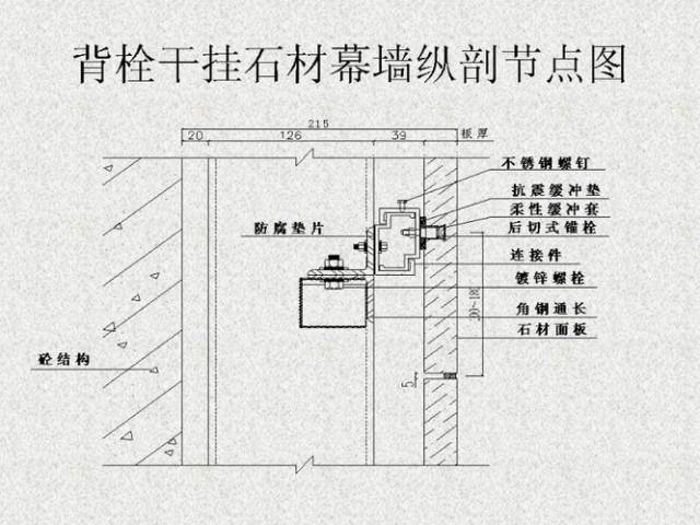 干挂石材是建筑外墙的一种施工工艺,该工艺是利用耐腐蚀的螺栓和耐腐蚀的柔性连接件。
