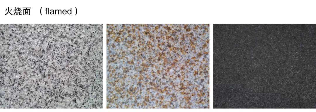 (4)火烧面( flamed ):表面粗糙,生产时对石材高温加热,晶体爆裂,快速冷却形成粗糙火烧表面,是花岗岩最常见的饰面种类,景观设计中铺装最常用的饰面材料。