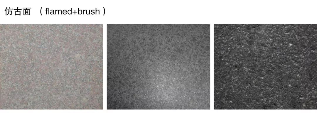 (7)仿古面(flamed+brush):为了消除火烧面表面刺手的特点,在石材先用火烧之后,再用钢刷刷3-6遍,即形成仿古面。仿古面的做法还有很多,比如火烧后水冲、酸蚀、直接钢刷或高压水冲面等。仿古面的加工比较费时,同时价格也比较贵。