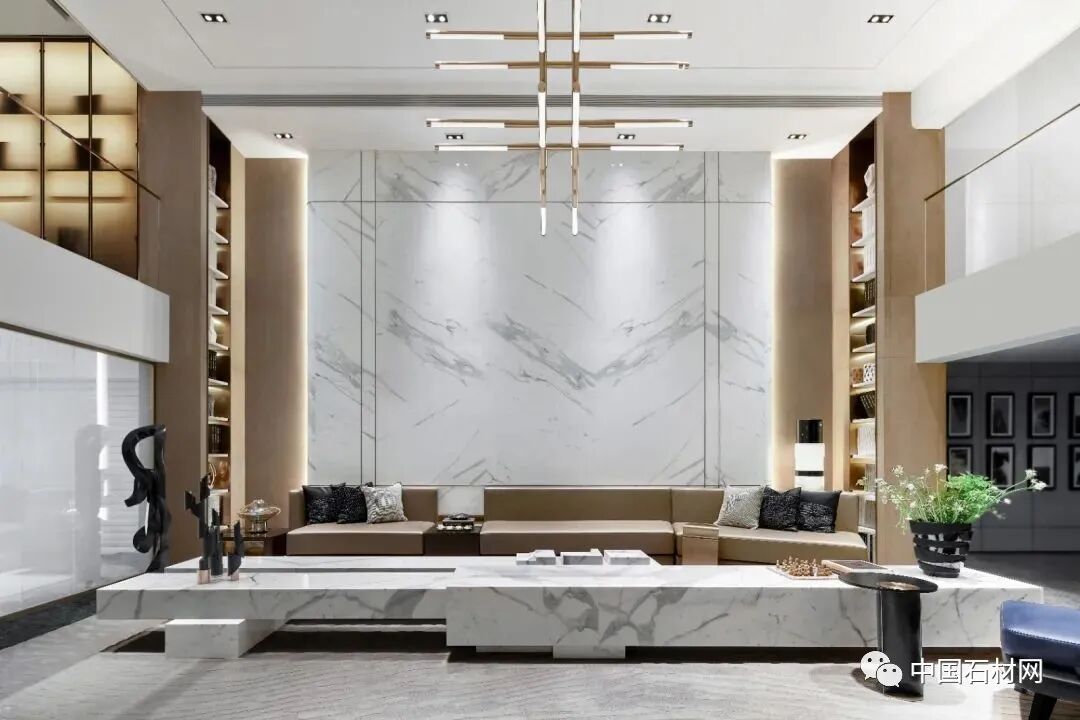 背景墙,一般用在客厅,是这个空间的设计重点。大理石的可塑性与多样性为设计师提供了许多设计灵感与方案。
