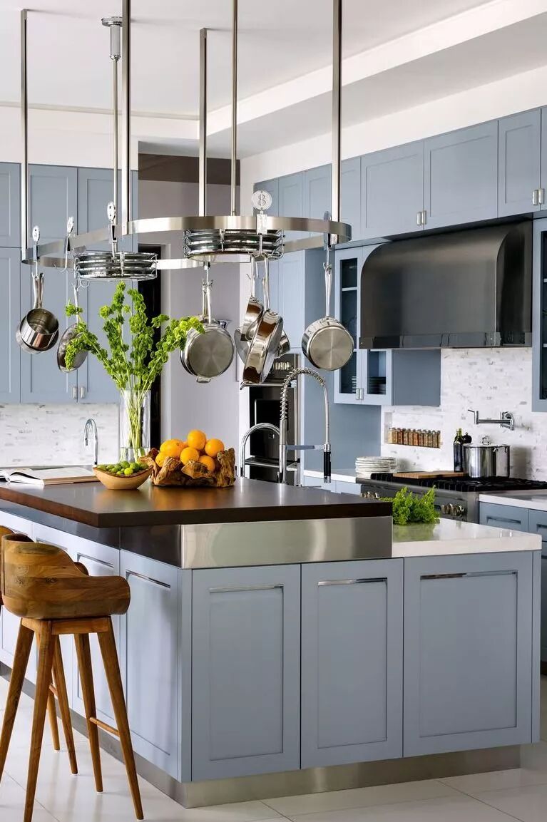 沃克•赞格(Walker Zanger)用大理石瓷砖制成的经典后挡板,为蓝色厨房增添了平衡感,。