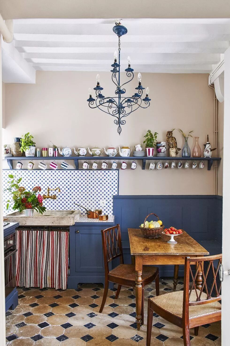 房主在卢瓦尔河谷房屋的厨房中保留了原始的瓷砖后挡板和地板。在跳蚤市场上发现了英式红木椅子和时尚的枝形吊灯,为该空间增添了生机。