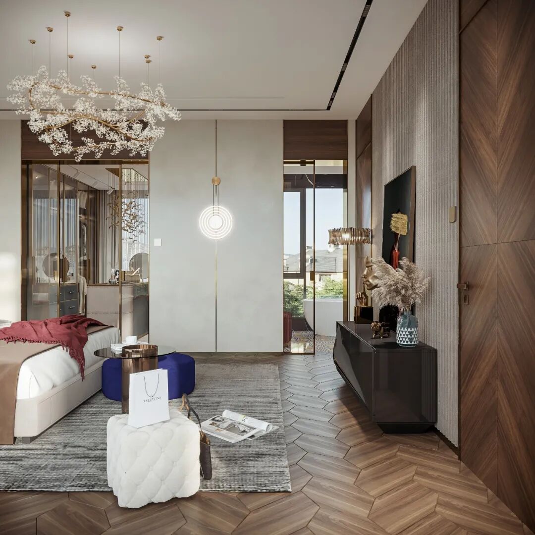 卧室是我们结束繁忙工作后的心灵归宿,主卧套房延续自然艺术的主题风格,原木气质辅以灰色中性色,于对比中显出和谐。以瞰景大落地窗,拉伸其景观视野,为主人呈献私属观景空间。