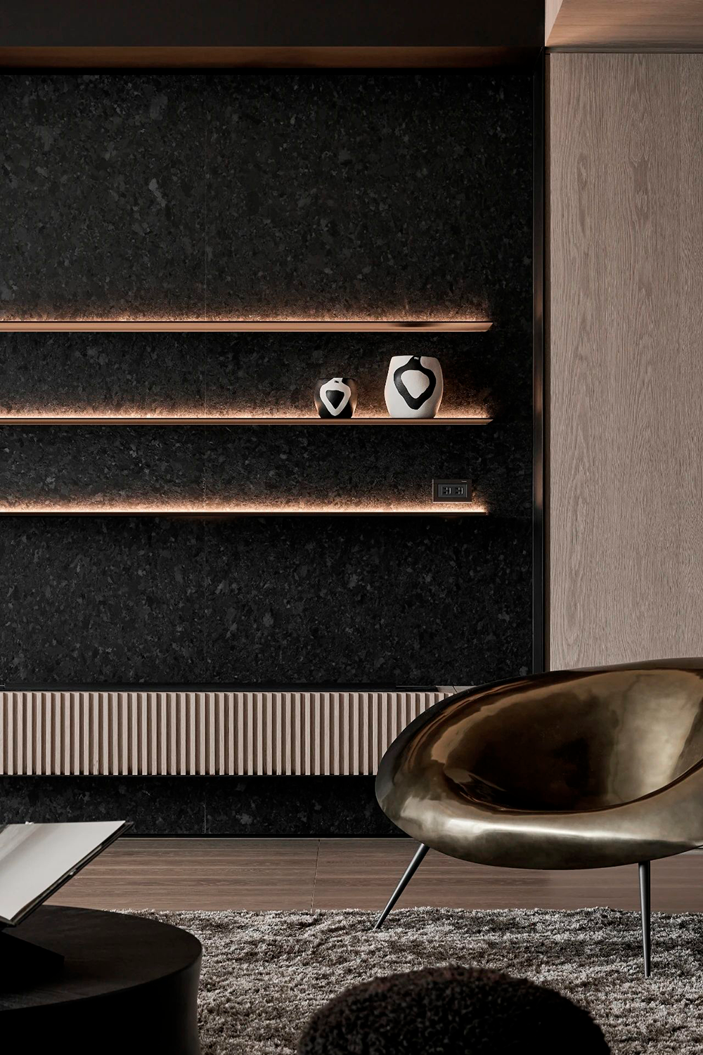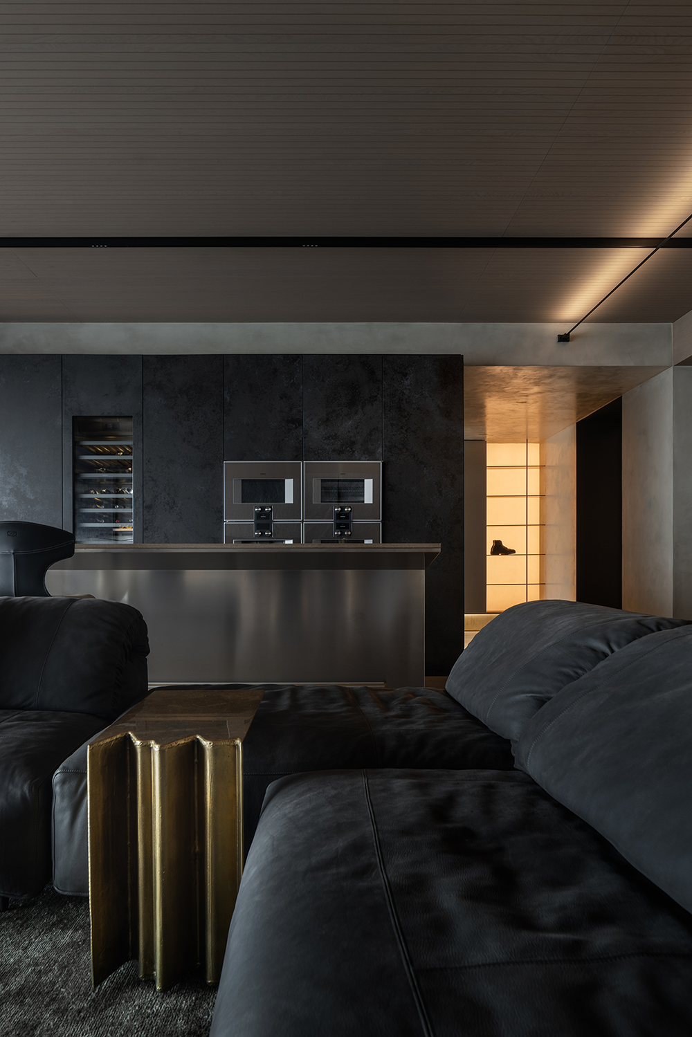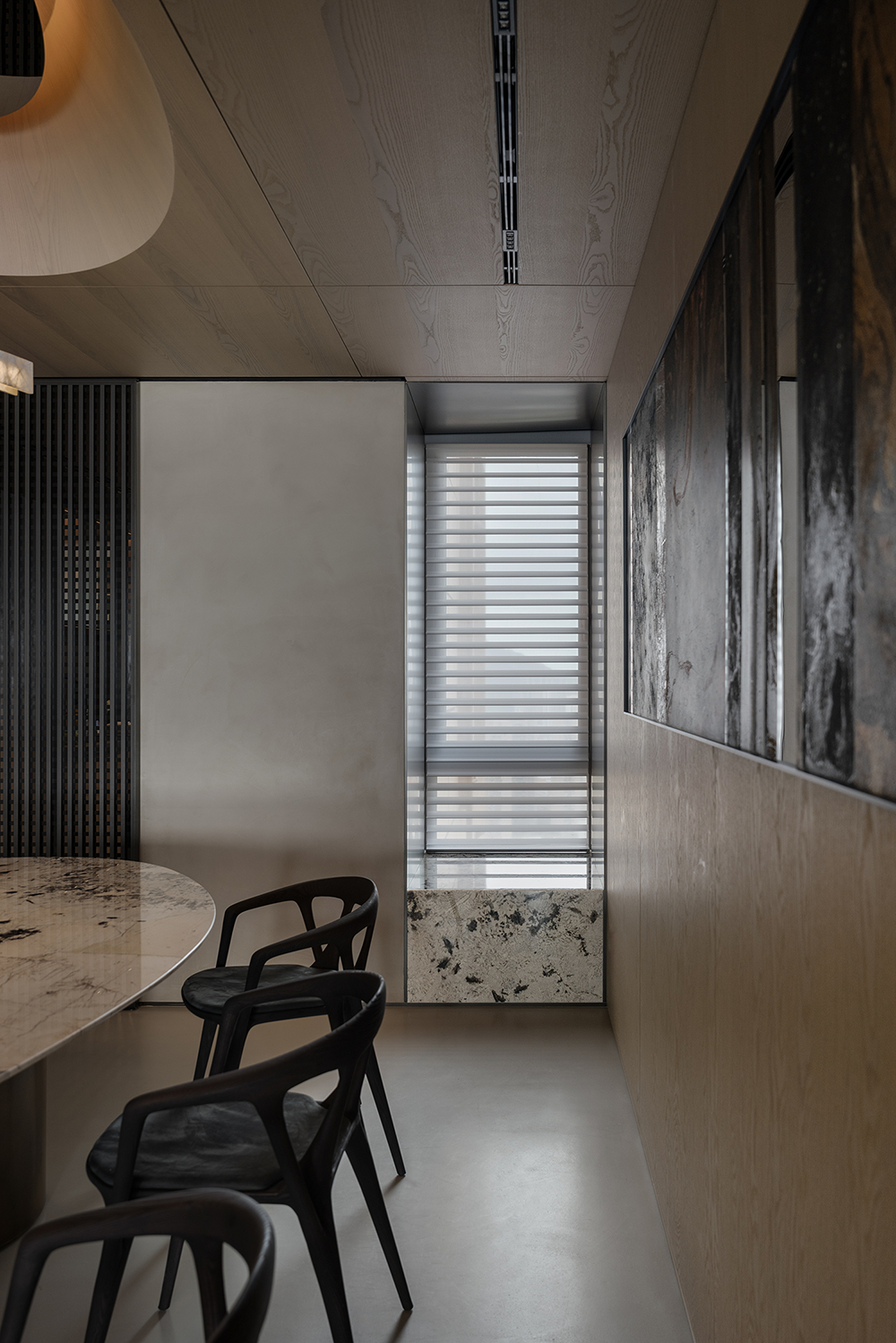 石材的厚重、手刷铜的质感、皮革的柔和与木皮的自然质朴,通过比例的调和,在这个空间中得到了完美展现。