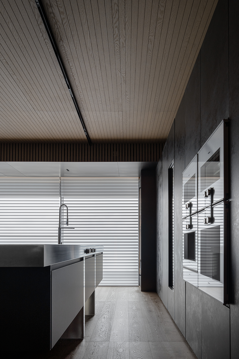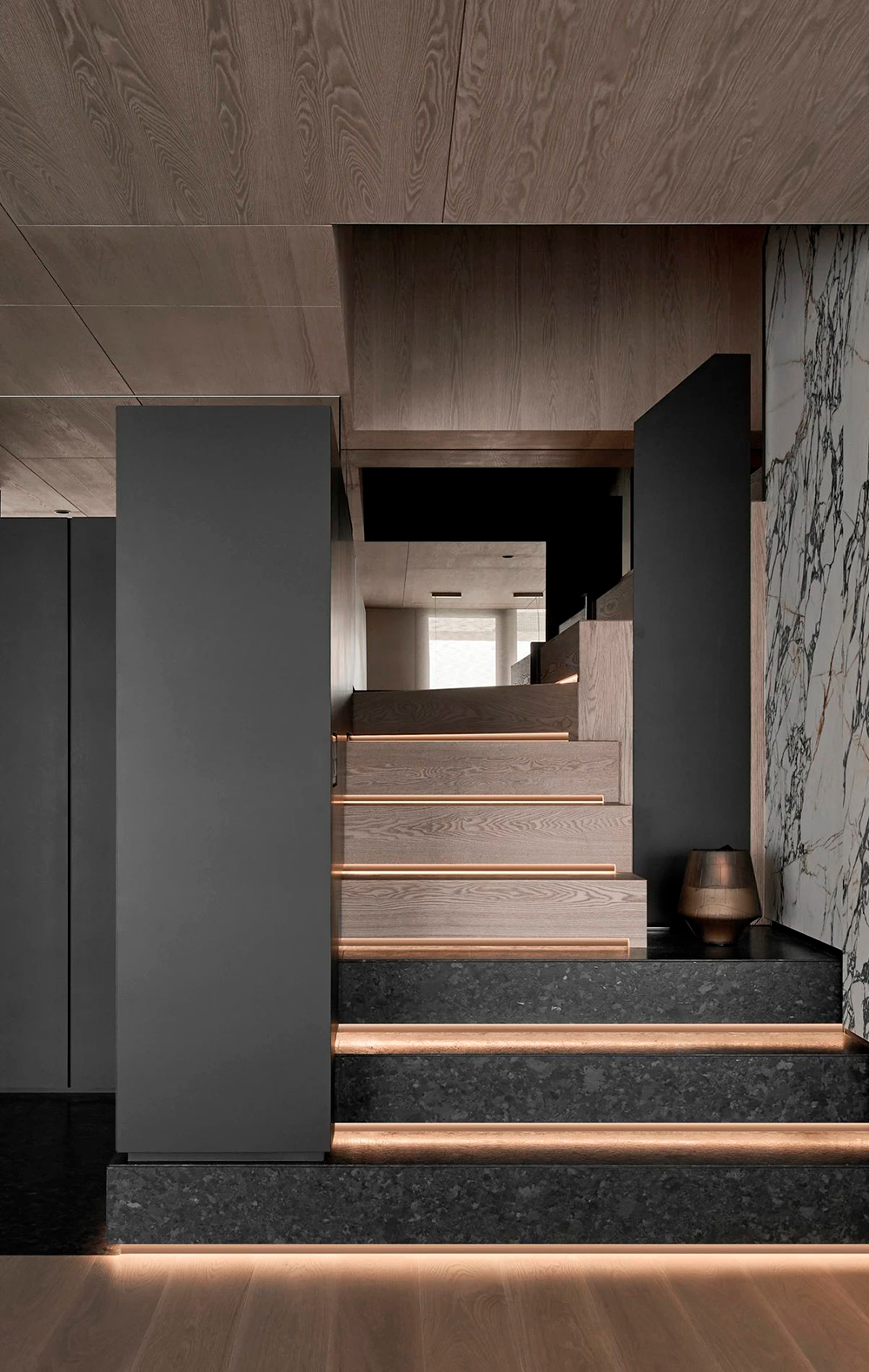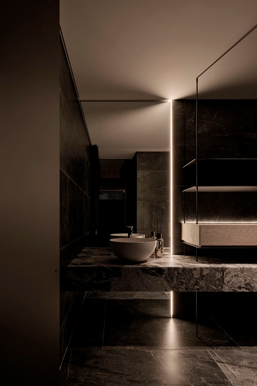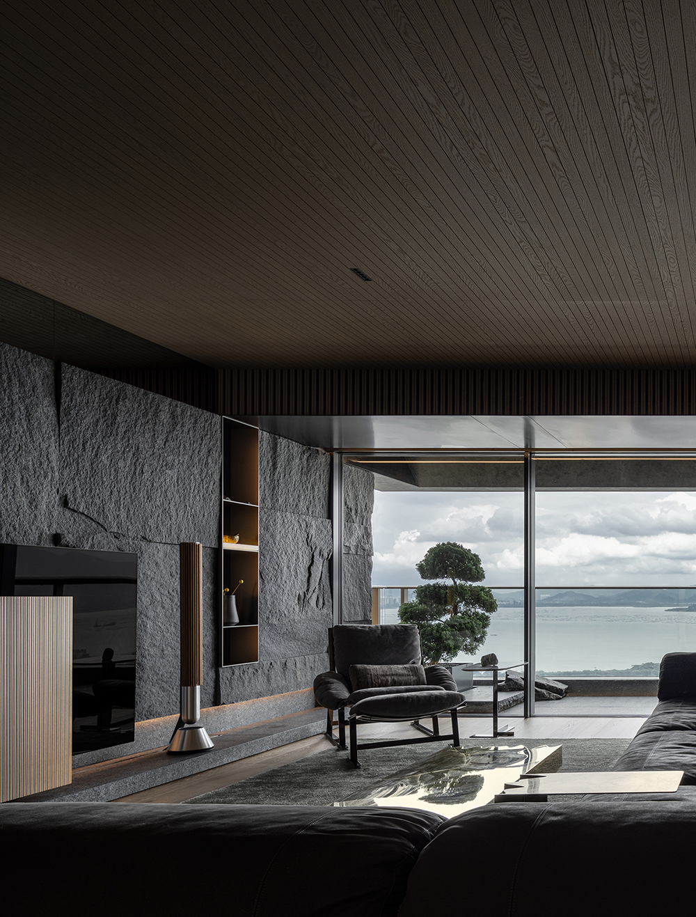 石材的厚重、手刷铜的质感、皮革的柔和与木皮的自然质朴,通过比例的调和,在这个空间中得到了完美展现。