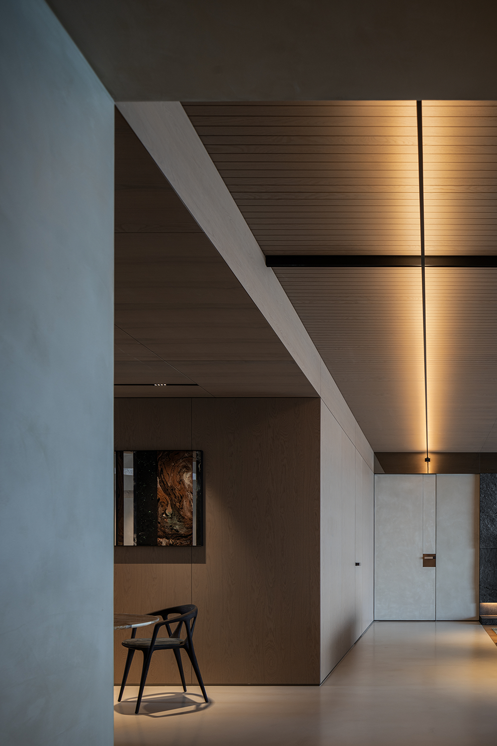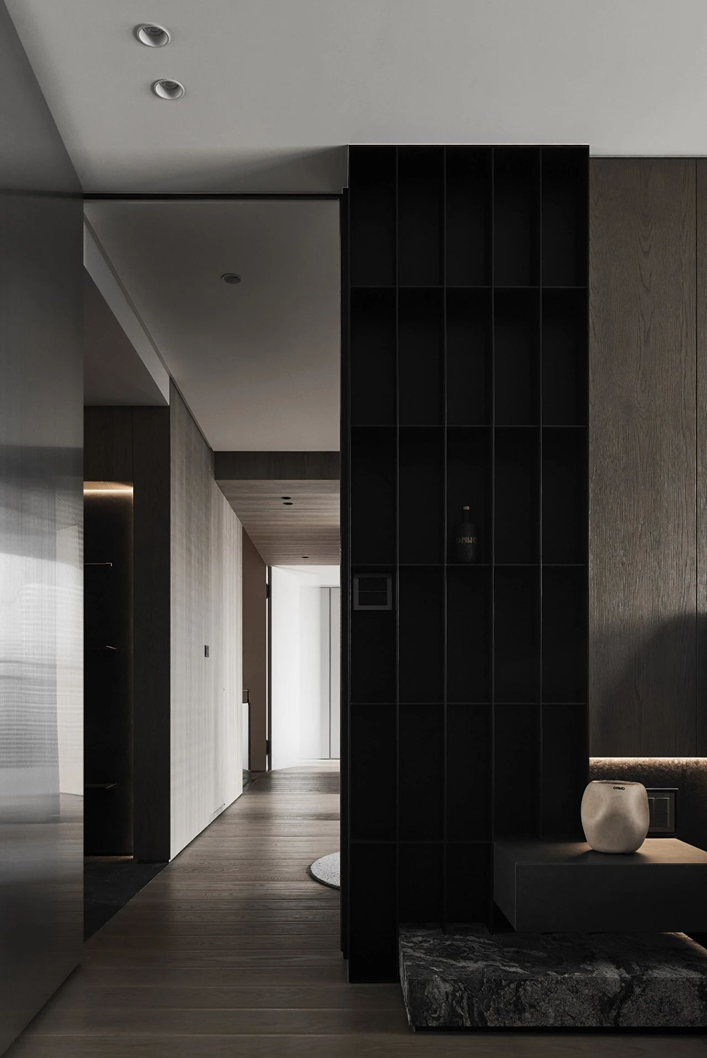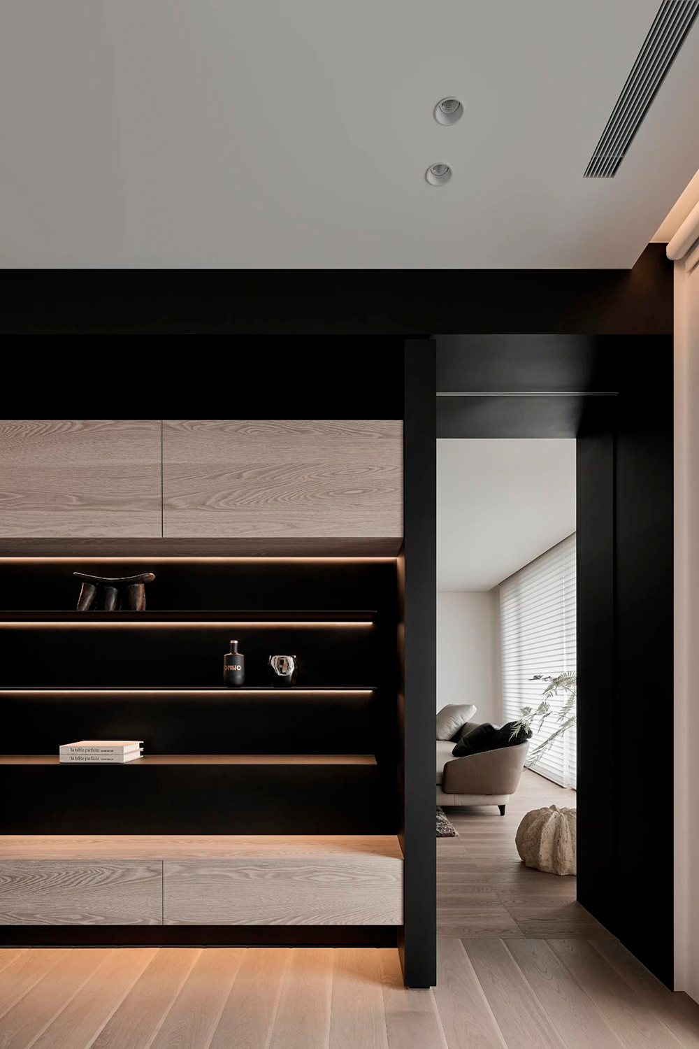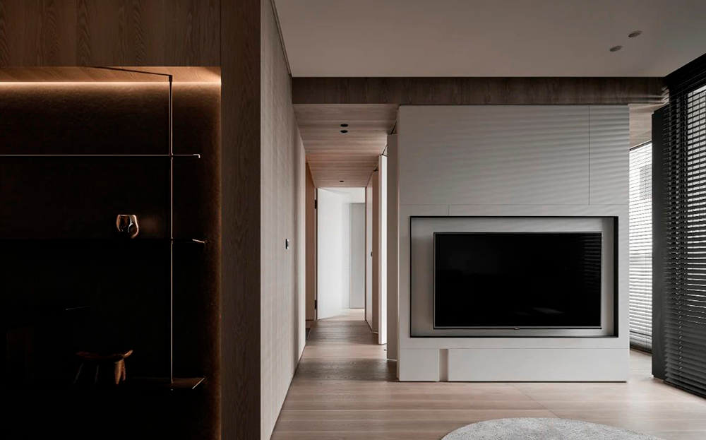 入户玄关采用横竖交错的线条与面体,营造折叠的自然解构,通体的发光膜,赋予陈列柜细腻入微的光感。