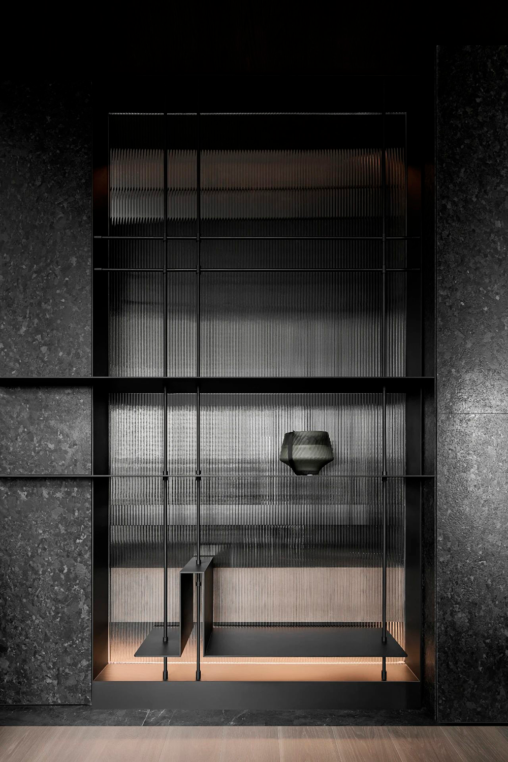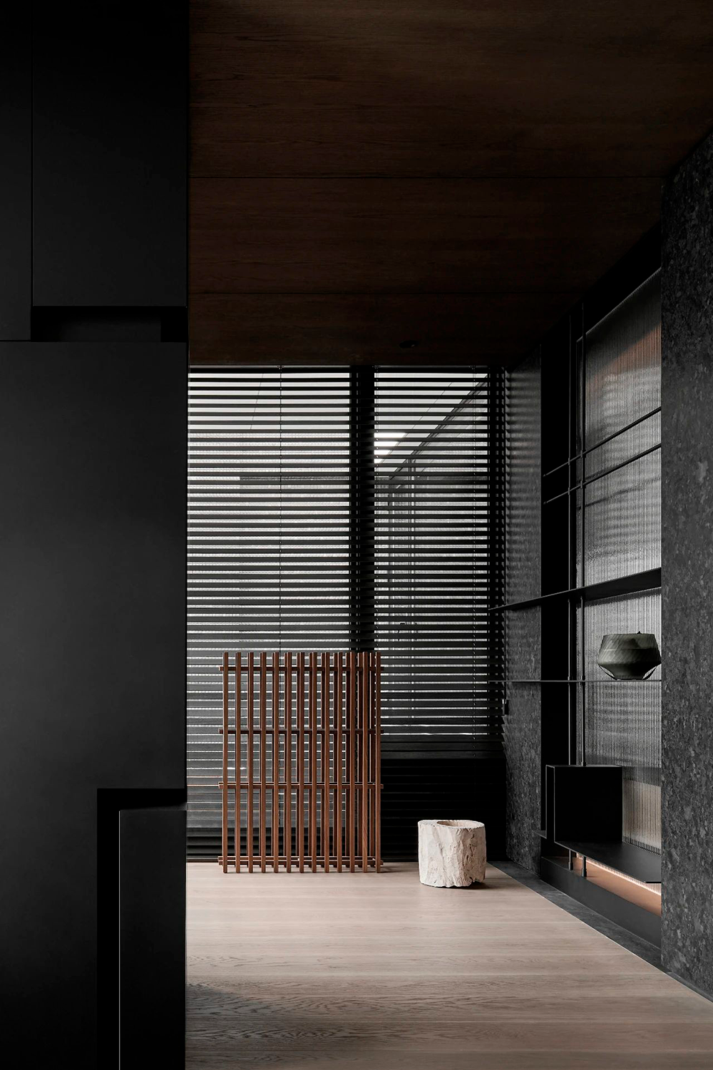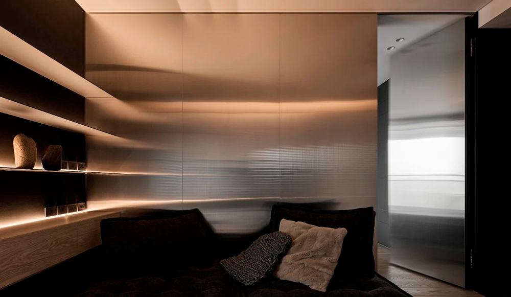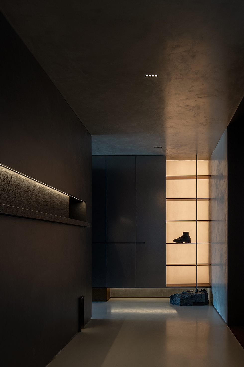 入户玄关采用横竖交错的线条与面体,营造折叠的自然解构,通体的发光膜,赋予陈列柜细腻入微的光感。