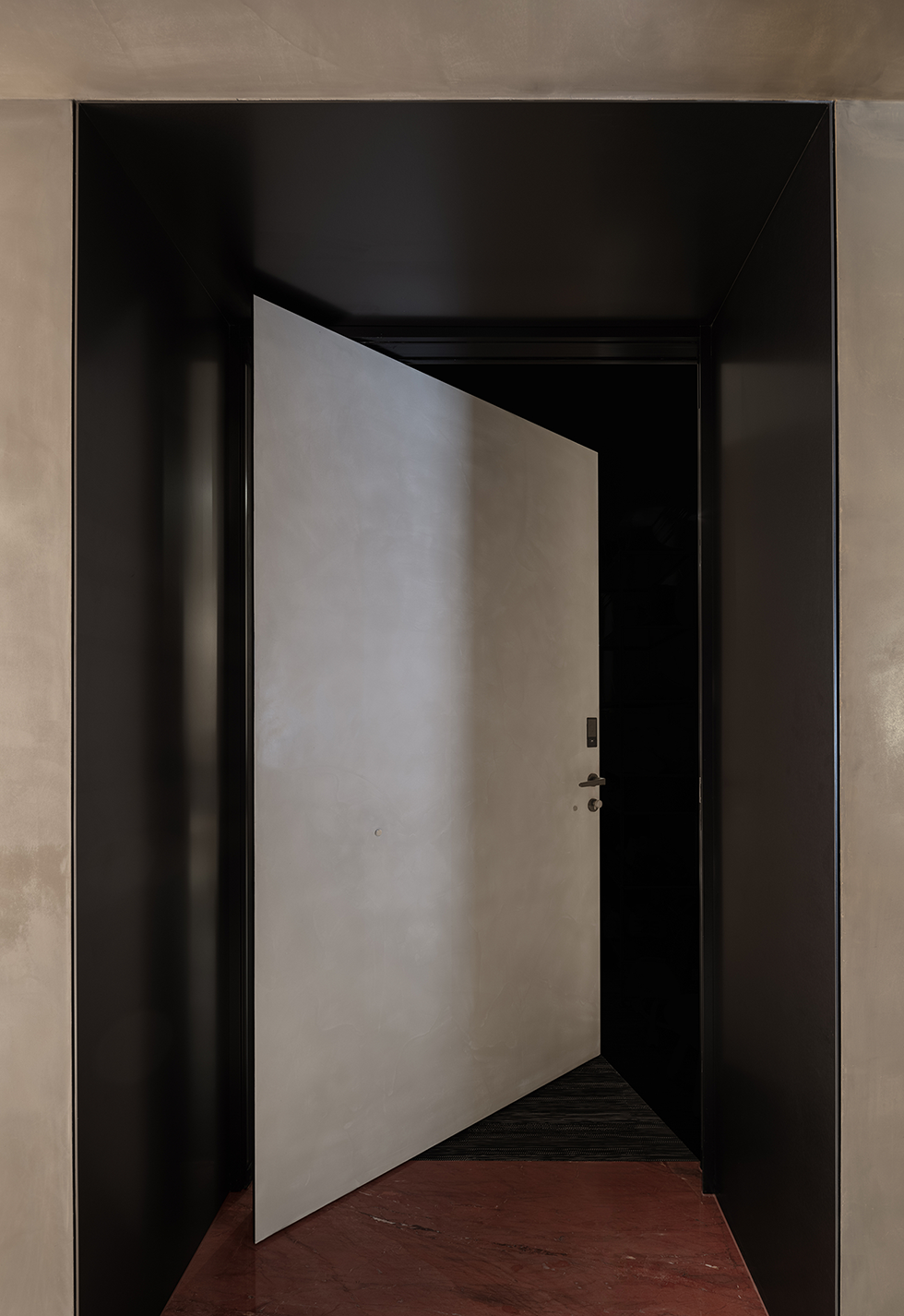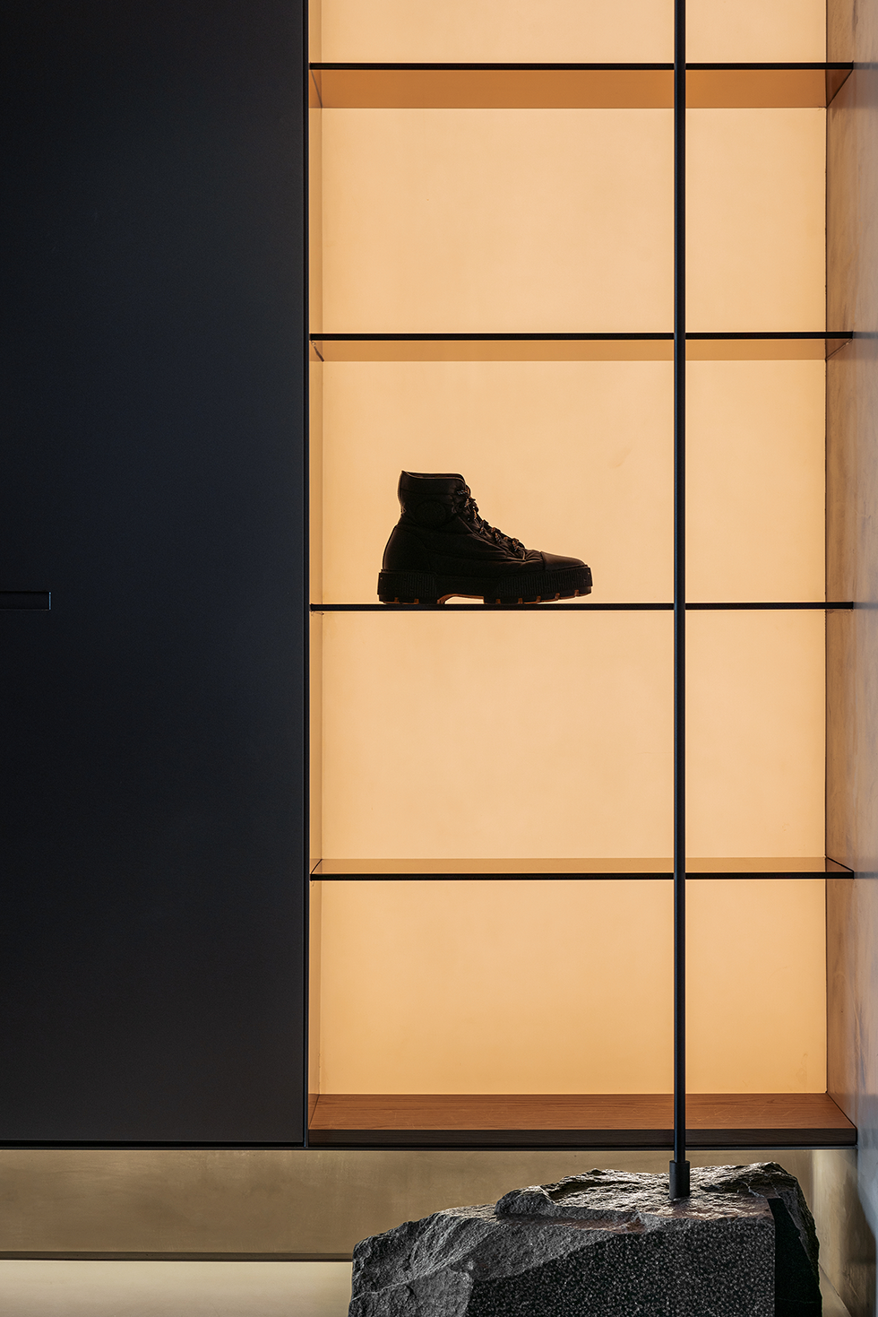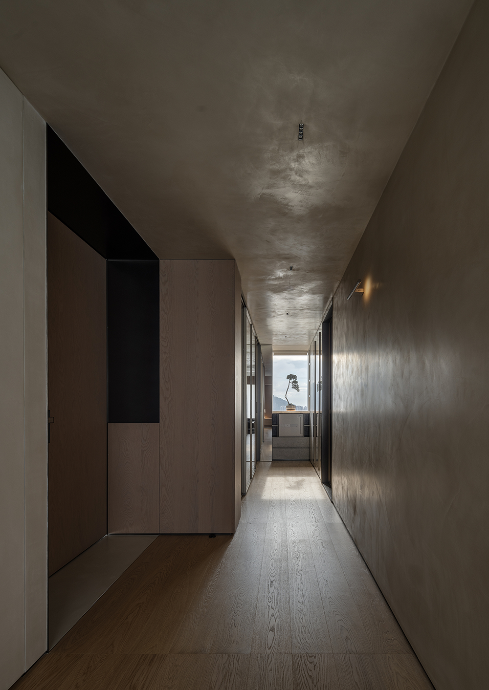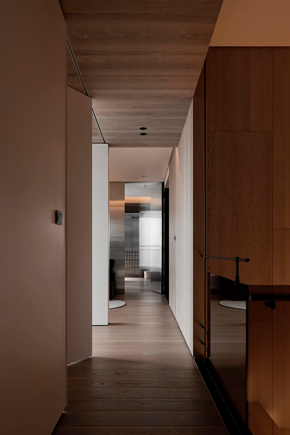 入户玄关采用横竖交错的线条与面体,营造折叠的自然解构,通体的发光膜,赋予陈列柜细腻入微的光感。