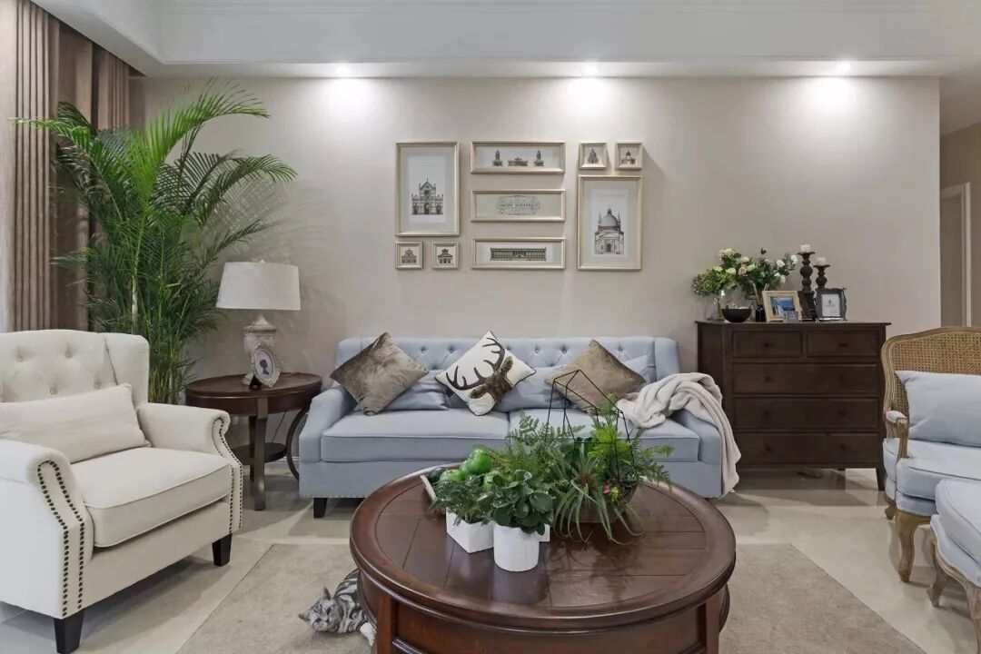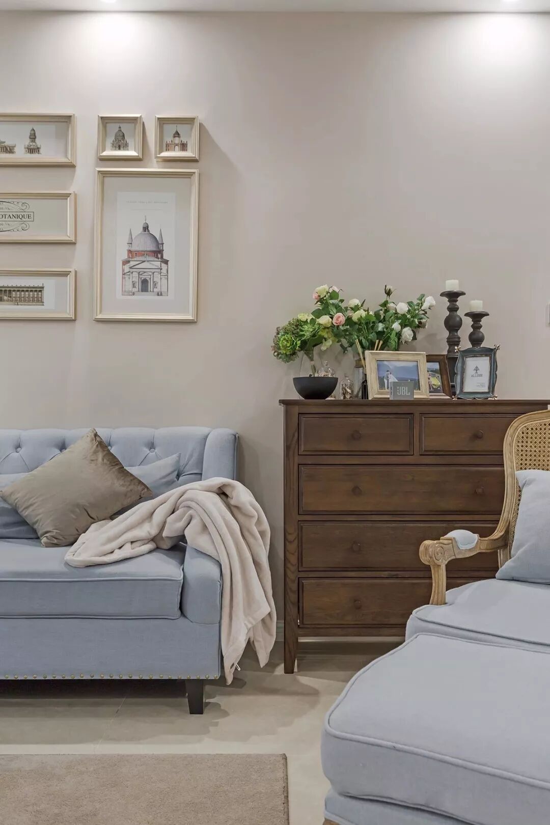 浅蓝色的两人沙发,未来再添一个小宝宝也够坐,两边配以两种不同款式的单人沙发,与茶几形成围合式空间。