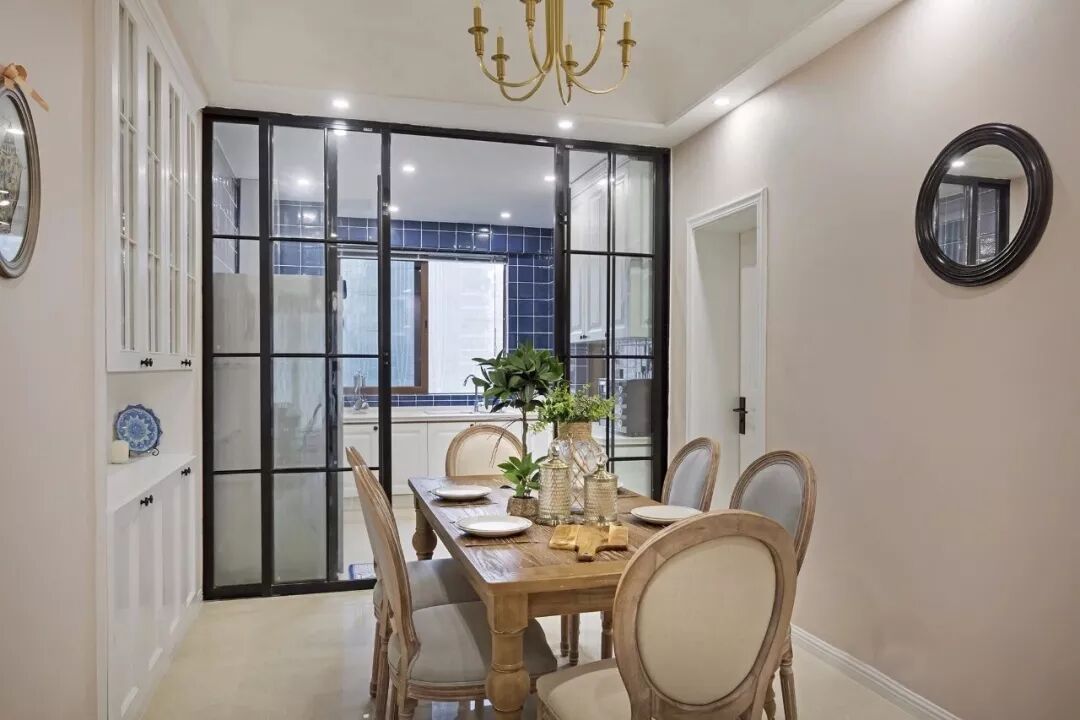 设计师用更加节省空间的嵌入式餐边柜设计让整体空间更开阔,同时配搭法式做旧的餐桌让格调温馨起来。
