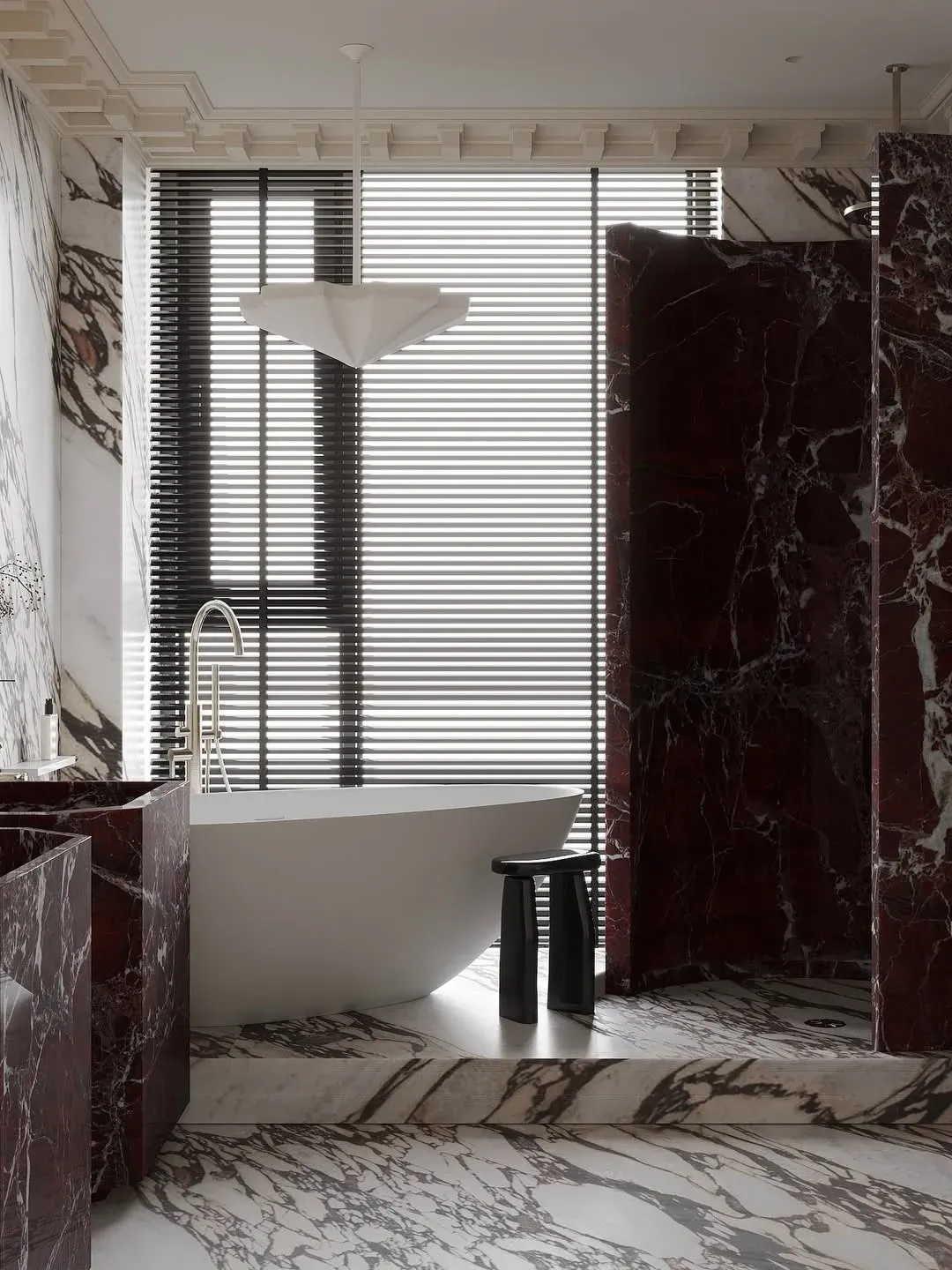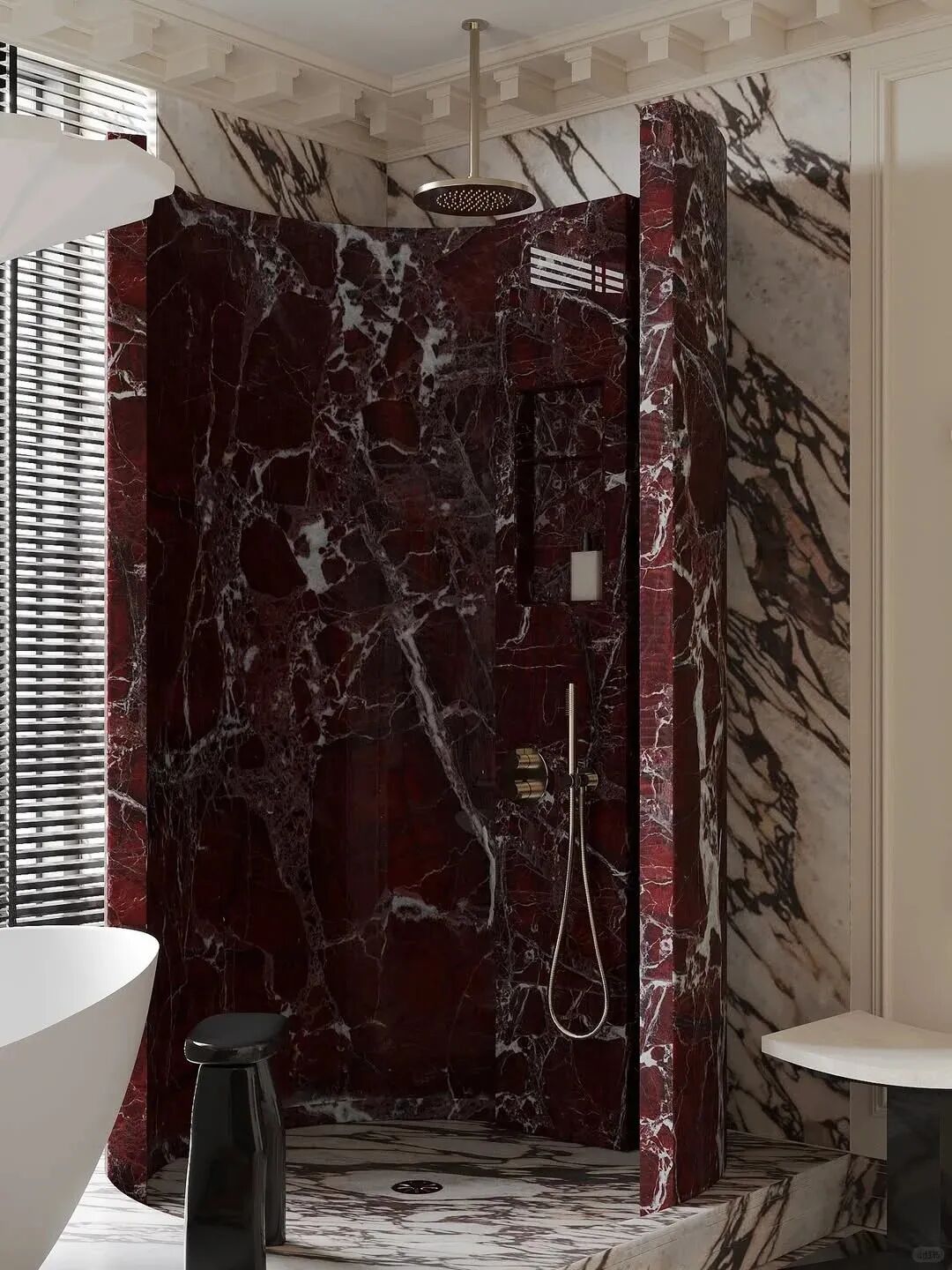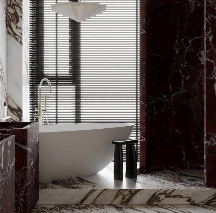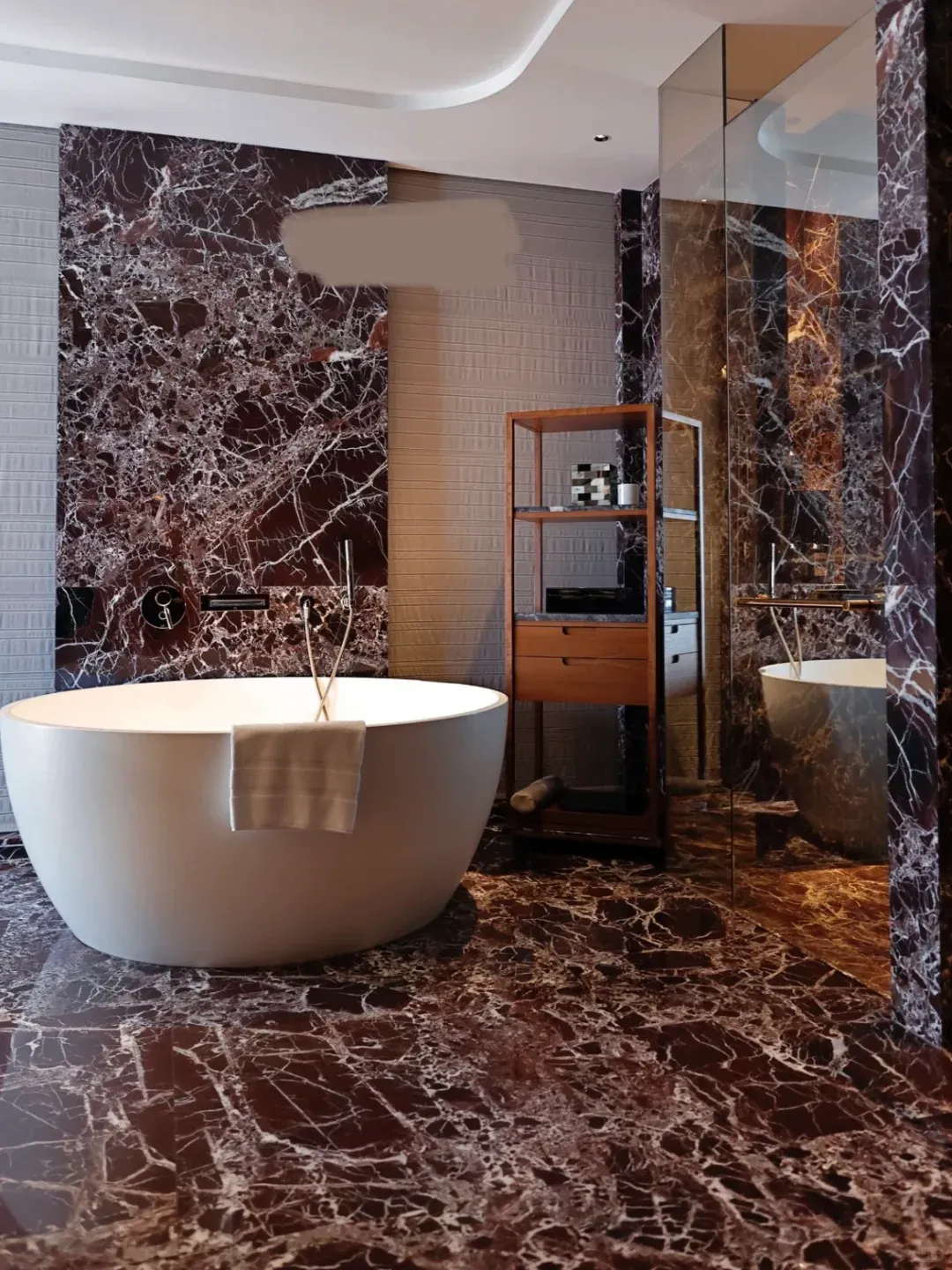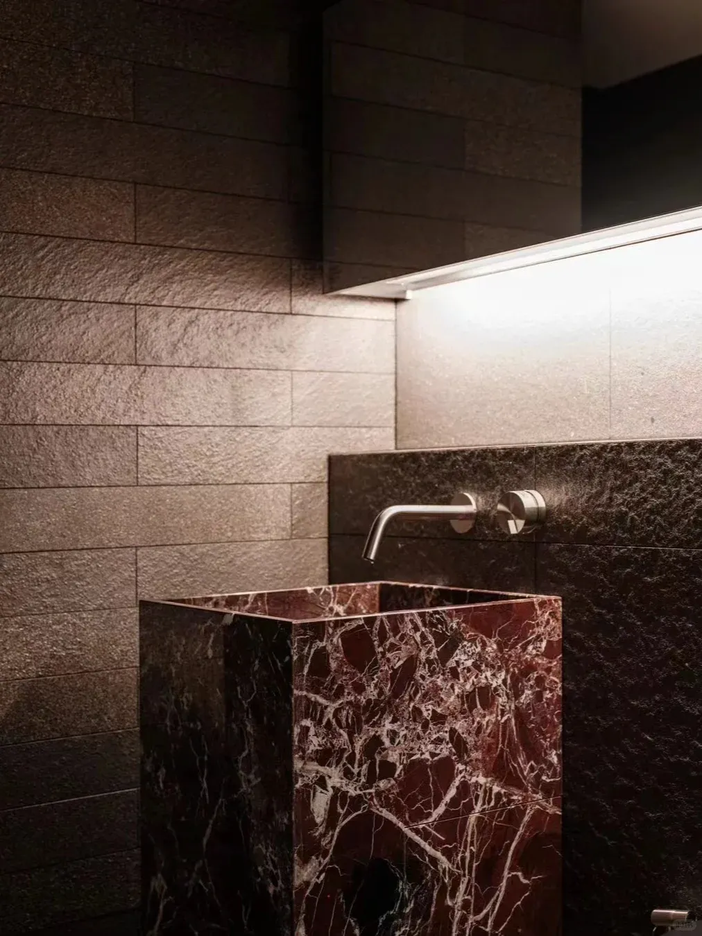 在卫浴空间中,这种浓烈的色彩碰撞出戏剧性的张力,当水流滑过石面,光影在红紫交织的肌理间跳跃,空间瞬间被赋予了生命般的呼吸感。