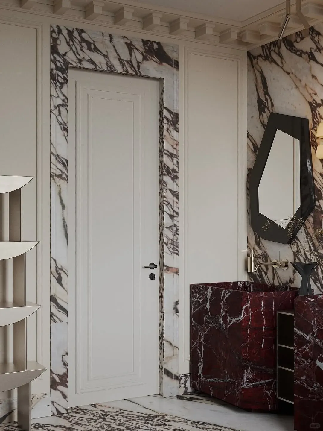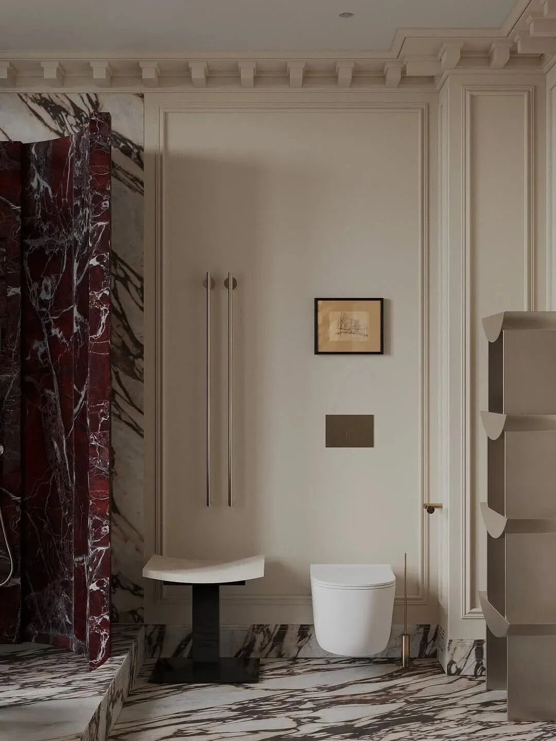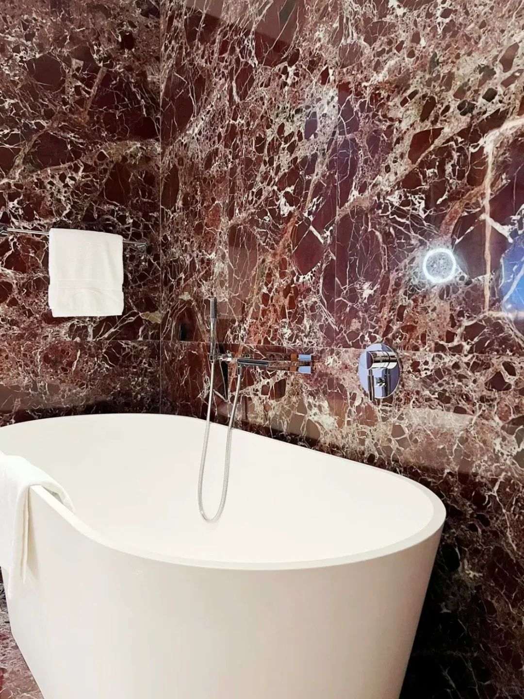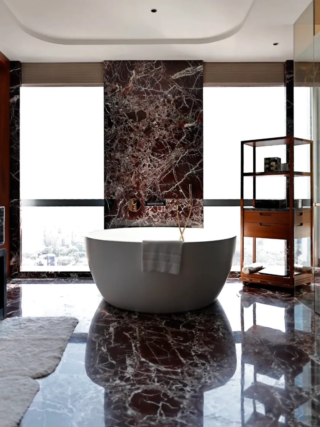 在卫浴空间中,这种浓烈的色彩碰撞出戏剧性的张力,当水流滑过石面,光影在红紫交织的肌理间跳跃,空间瞬间被赋予了生命般的呼吸感。