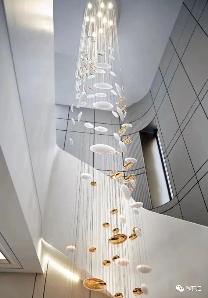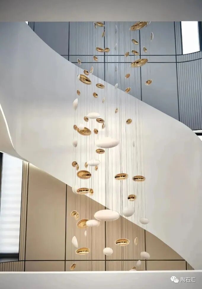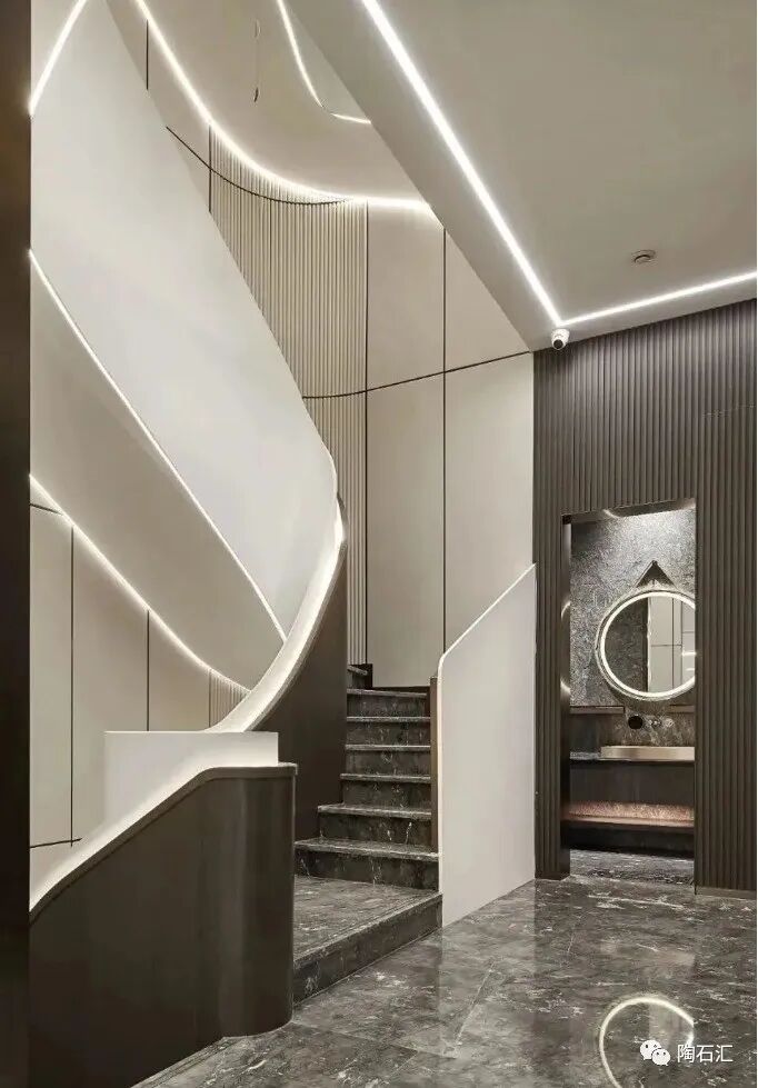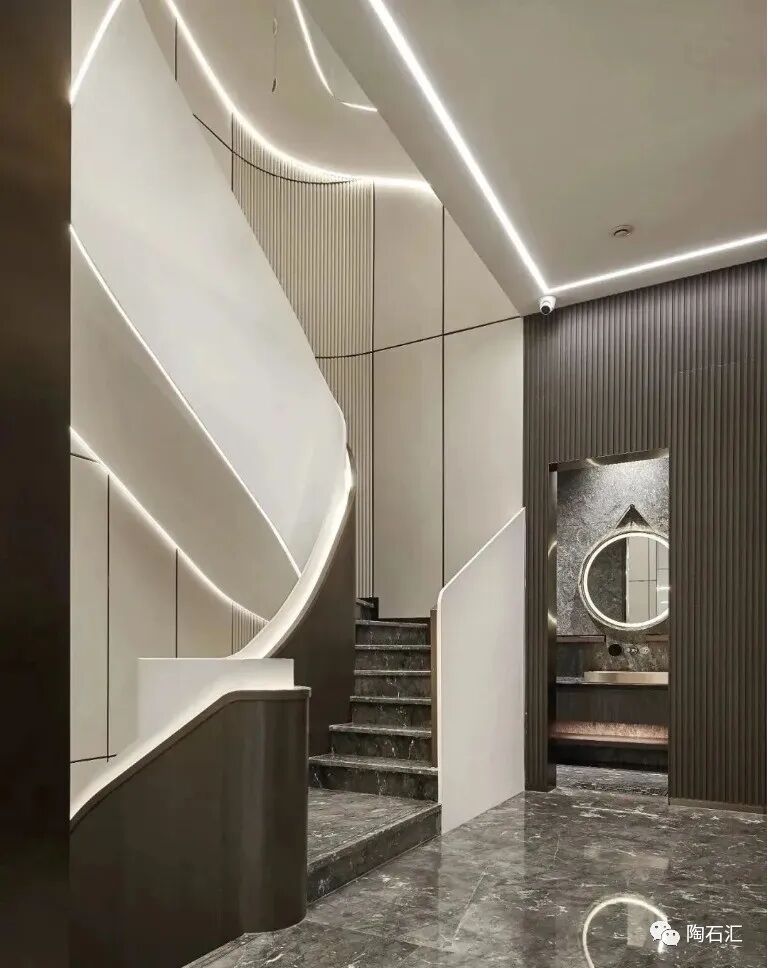 楼梯犹如一条长龙贯穿着每一层的空间,随着人的走动智能灯带也行云流水的流动。灰色的大理石装饰,沉稳、安静、时尚,光亮的大理石地面质感十足。