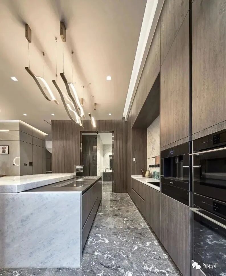厨房内也使用了同款灰色大理石地面,灰白色的大理石吧台,搭配棕色木饰面橱柜,整体颜色非常协调,不妖艳不耀眼却让人感受内在品位格调。