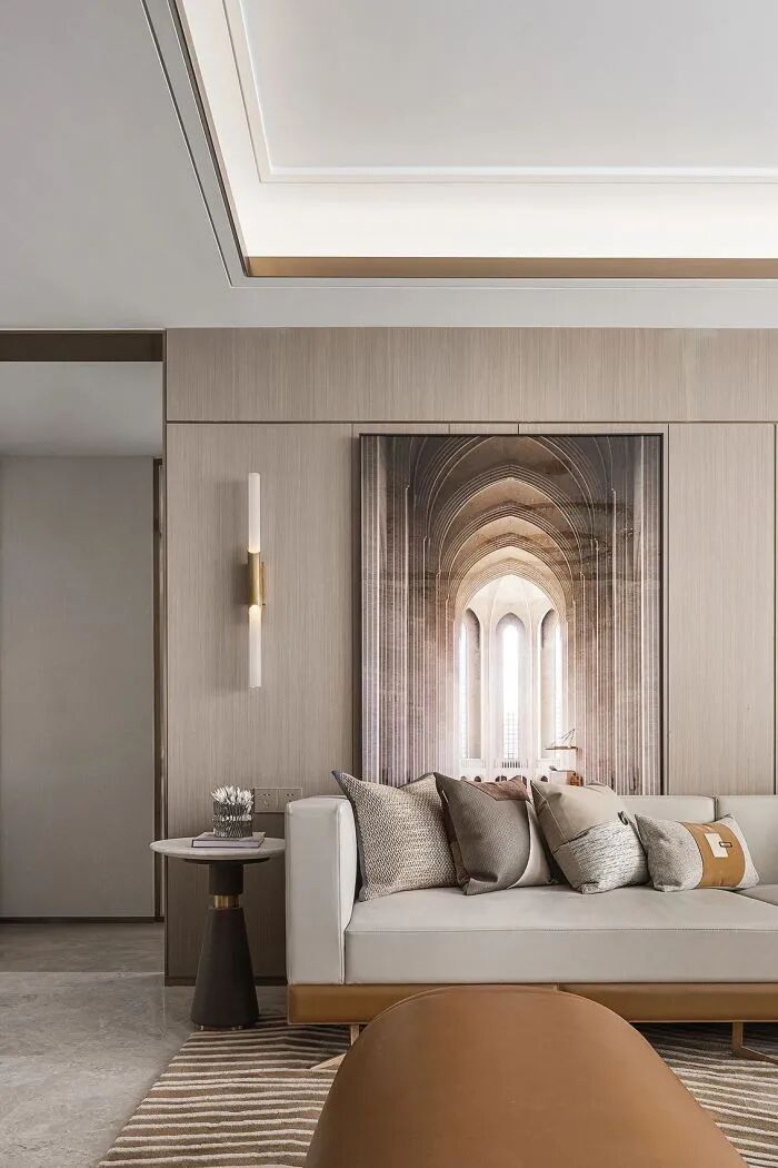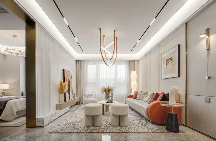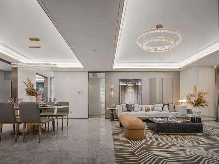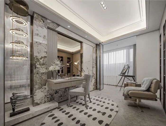 运用大理石勾勒当代都市生活的仪式感,塑造雅奢精尚的空间氛围,营造空间,现代感的金属环形吊灯、条状样式的地毯,融合颇具东方韵味的枯枝花艺,于当代都市图景的营造中,将生活与自然的意趣容纳其间。