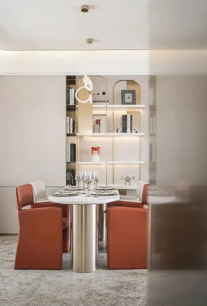 设计将客餐厅连通一体,构建现代家庭生活的开放式格局。石材与金属的碰撞,将低调奢华的格调渗透至空间各处,在彰显卓越工艺的同时,予人精致优雅的就餐氛围。