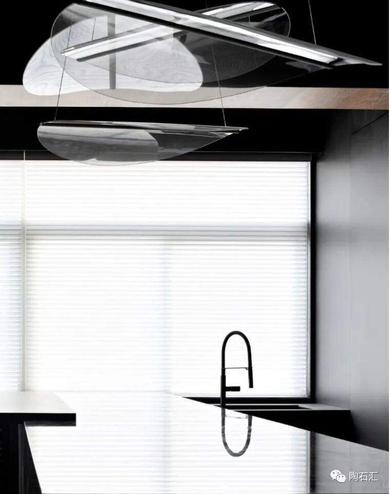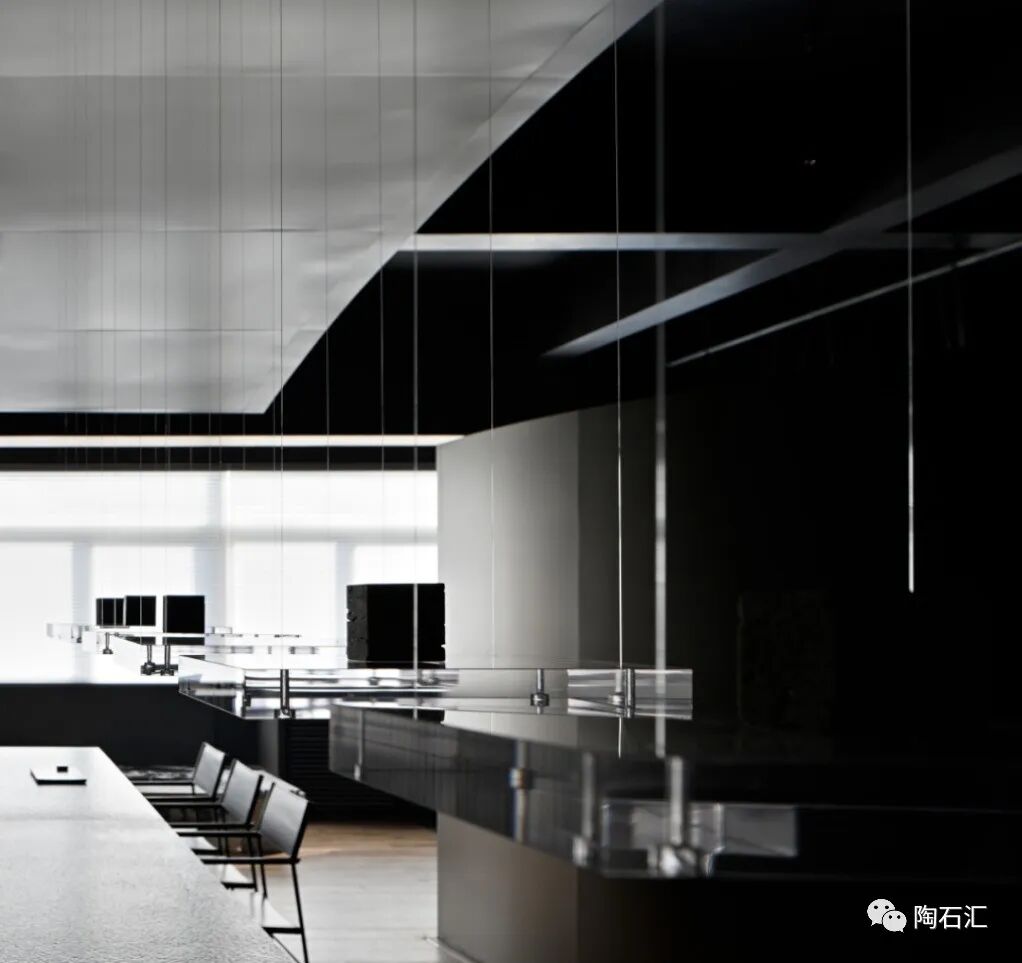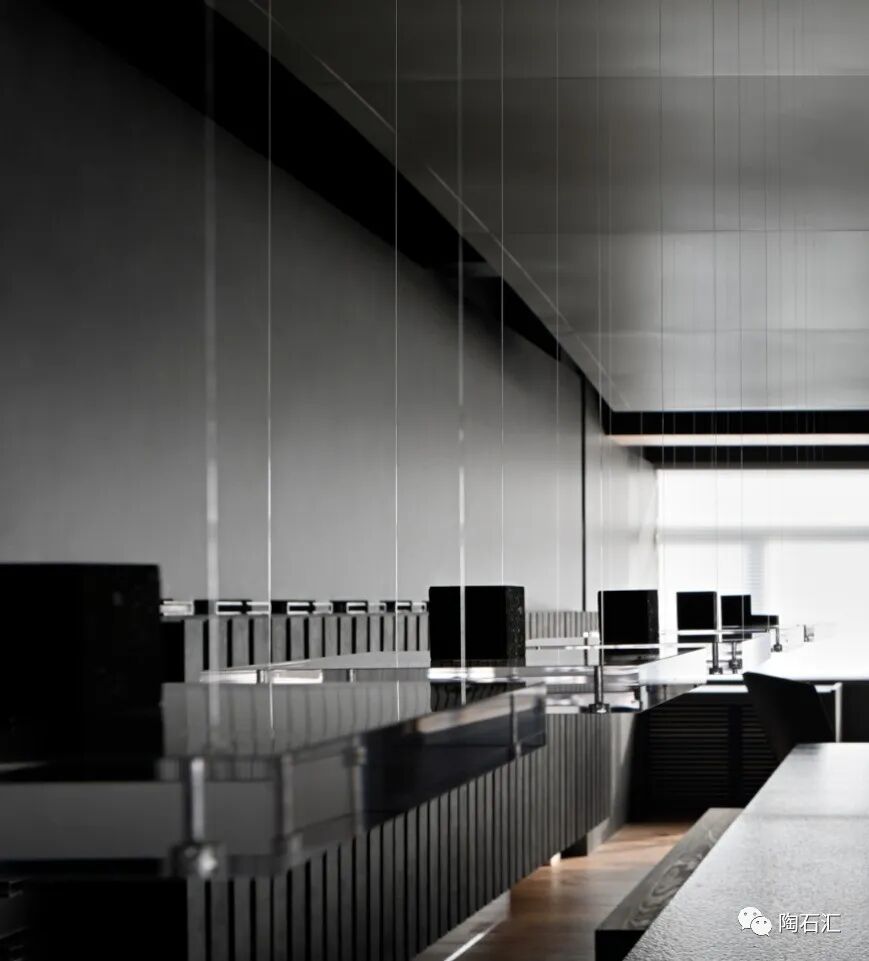超长定制长桌桌面选用黑色水磨石做喷沙肌理面处理,材质触达宇宙陨石的表面质感,搭配通透的亚克力厚板作为桌面支撑,两种截然不同的材质碰撞,巧夺天工,无与伦比。