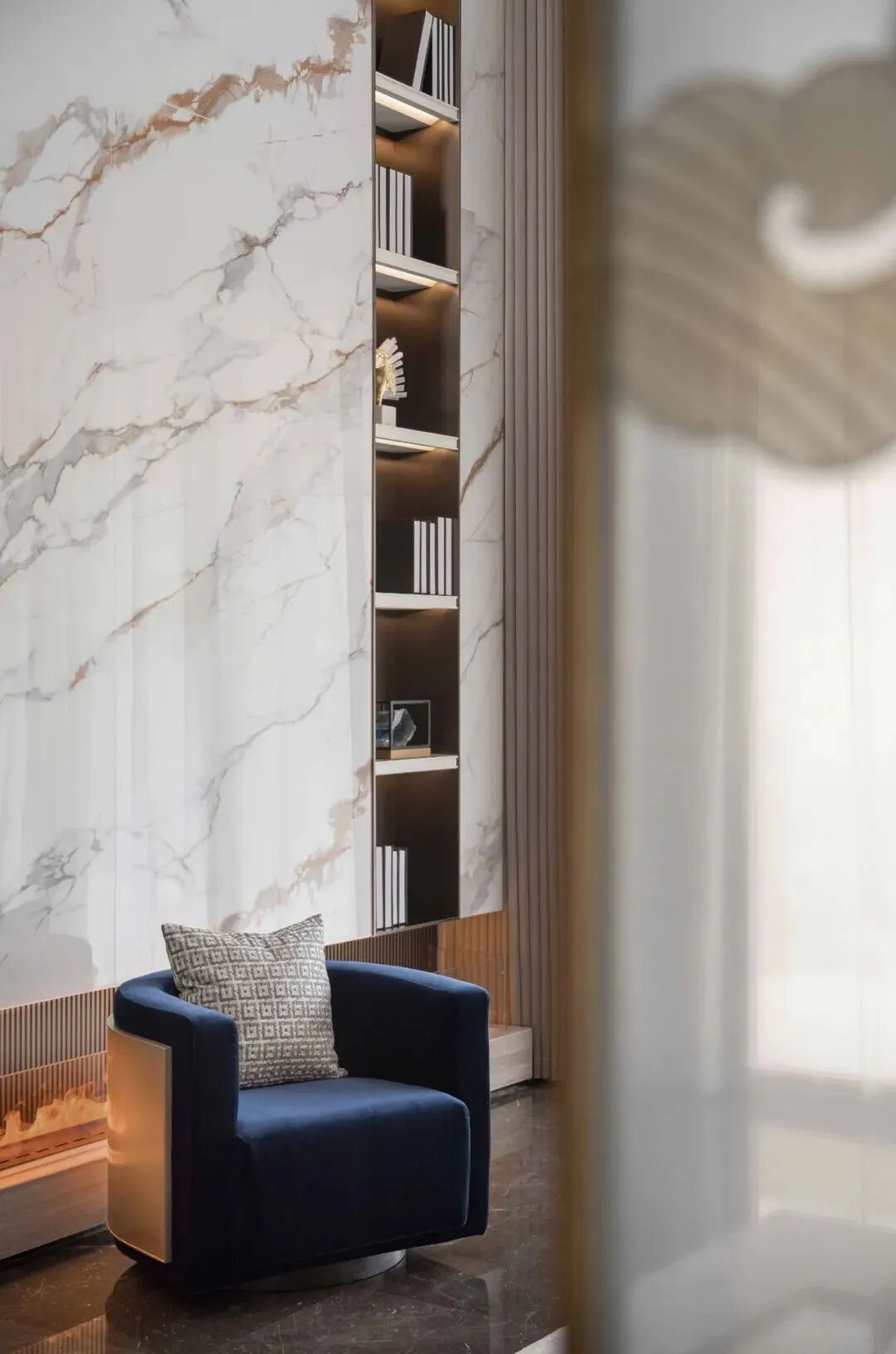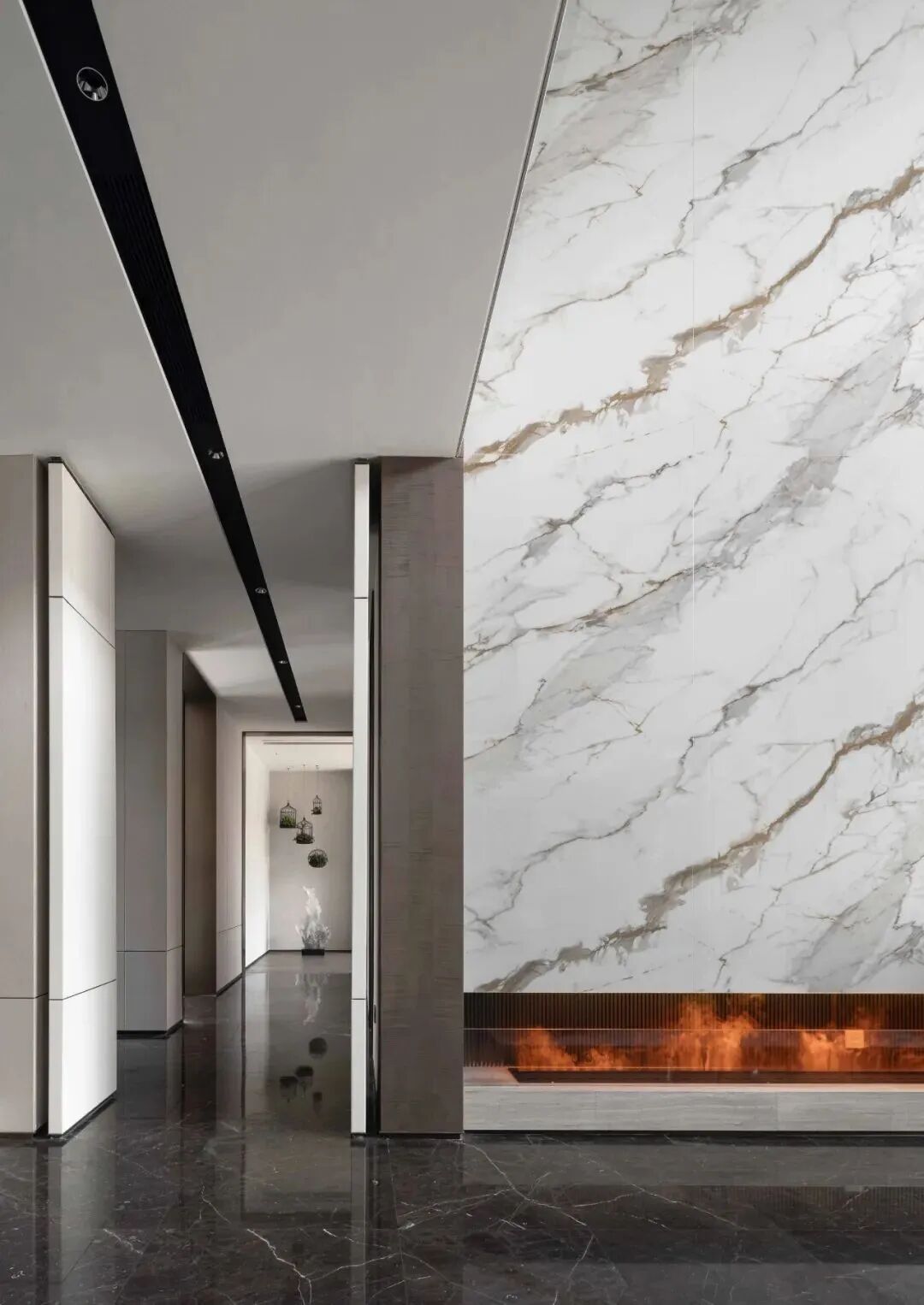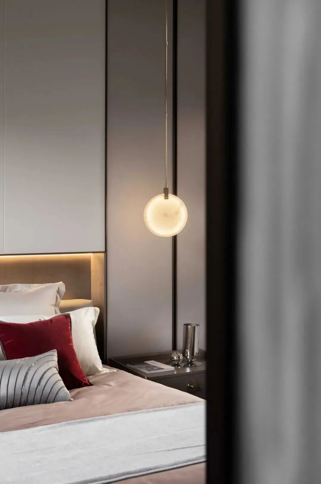 移步宜景,客厅豁然开朗,充盈的光线在空间恣意游走,穿梭在多元混杂的动静之间,大理石为沉稳的空间注入涟漪,整体布局疏不空、满不溢,闲立窗前观月生,远处青山绵延,深处的气息随月白窗纱氤氲飘浮。