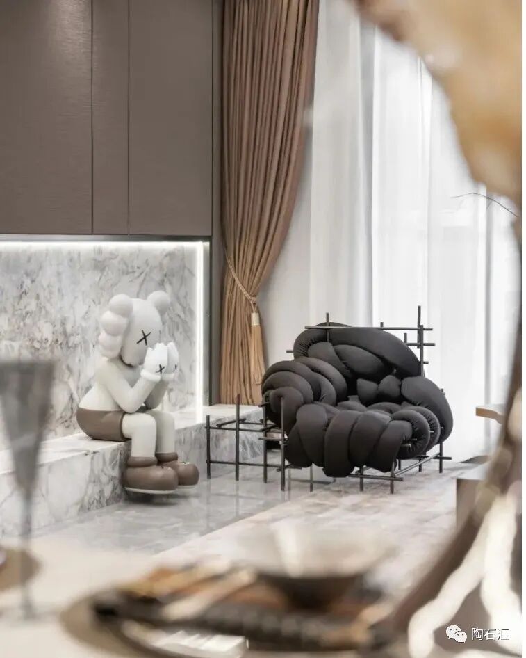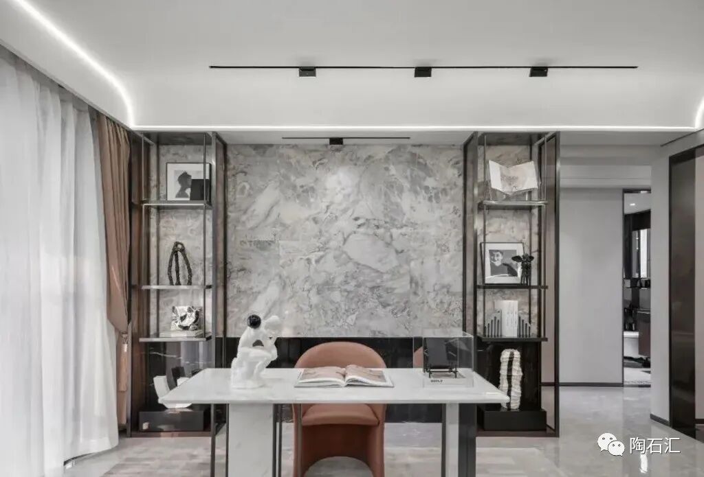 大理石加深色金属点缀书桌,造型舒适的皮质导演椅体现书房空间的别致。配以富有艺术感的摆件,彰显摩登个性。