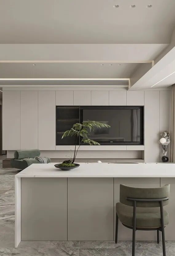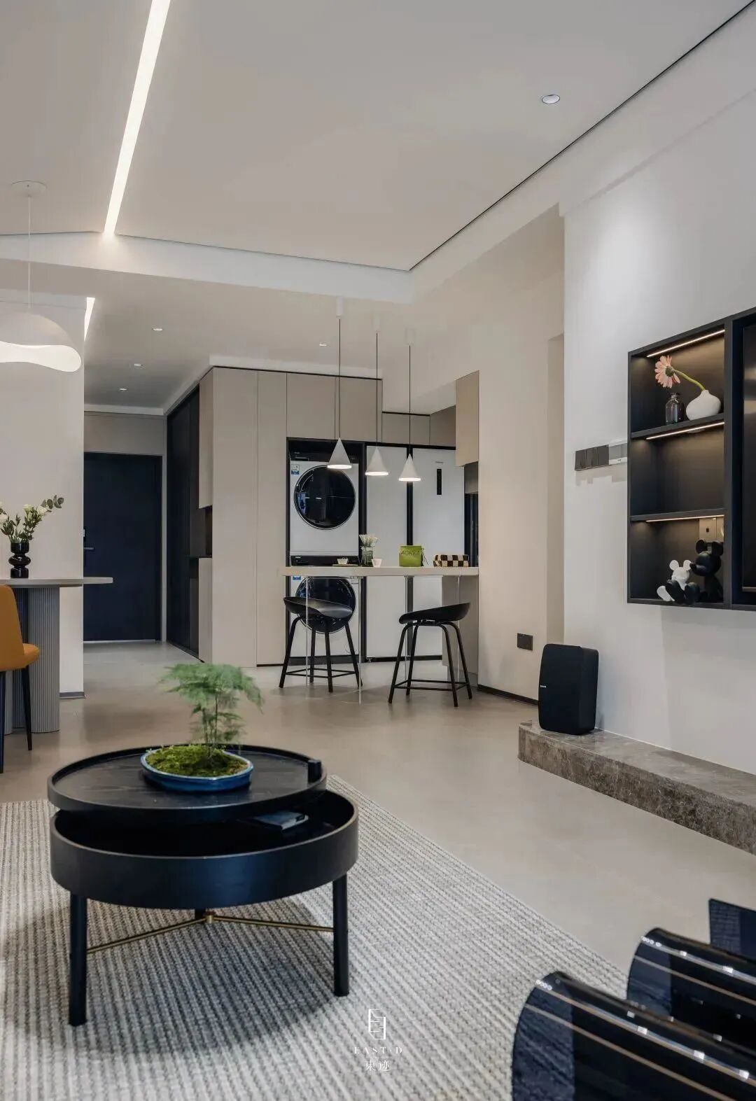 在厨房方向延伸出来的餐桌,增添整个空间当中的设计感,同时也可以很好利用空间当中的布局,让空间更有实用性。