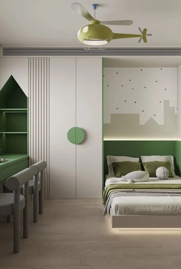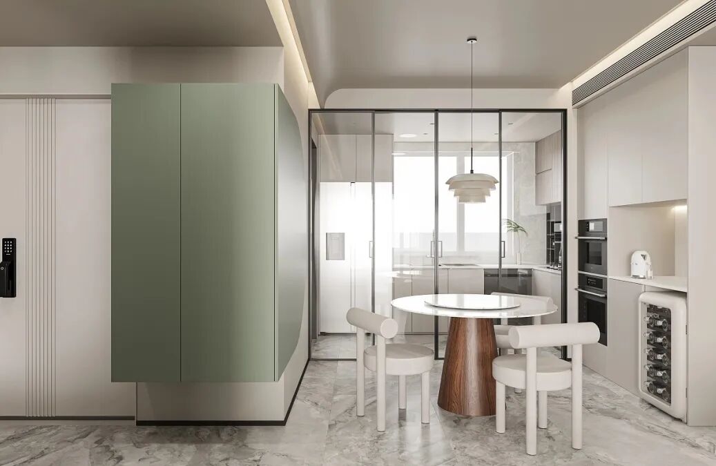 绿色沙发旁边,一套圆融舒适的餐桌椅,在吊灯灯光渲染下的艺术性氛围圈定了餐厅的范围,将现代主义的生活美学淋漓展现。