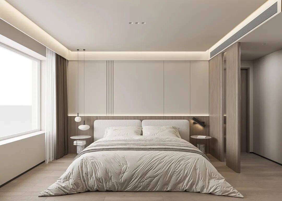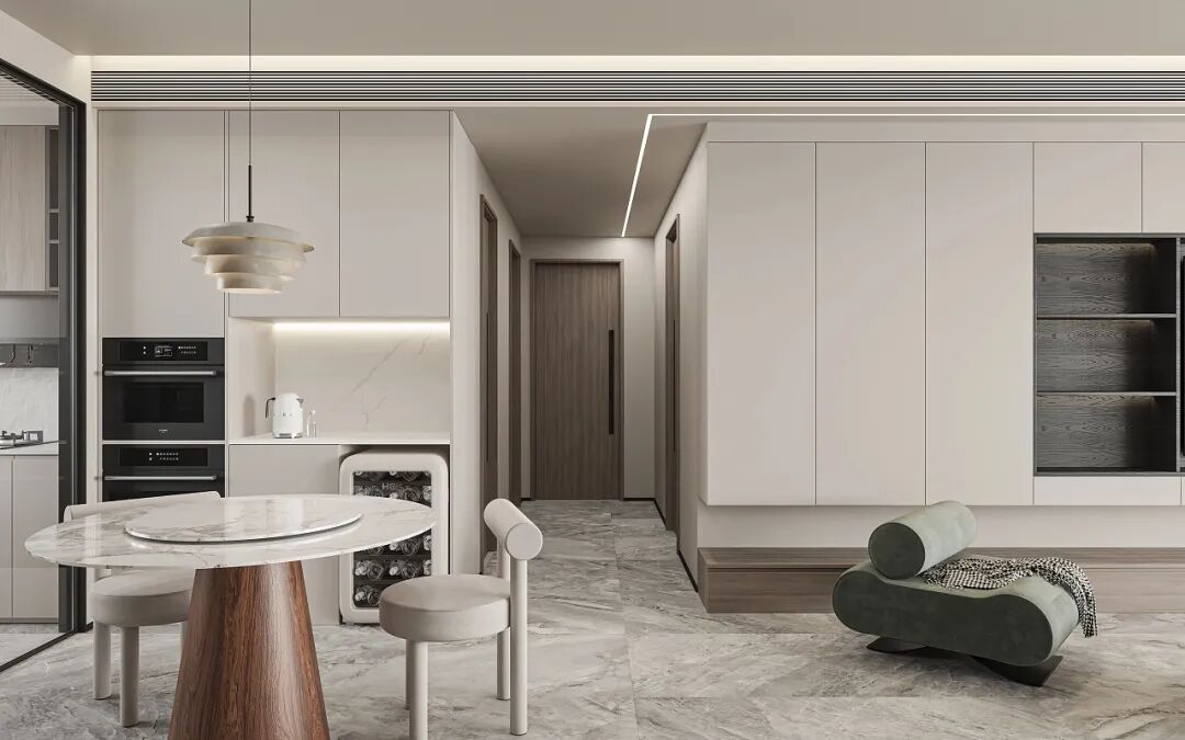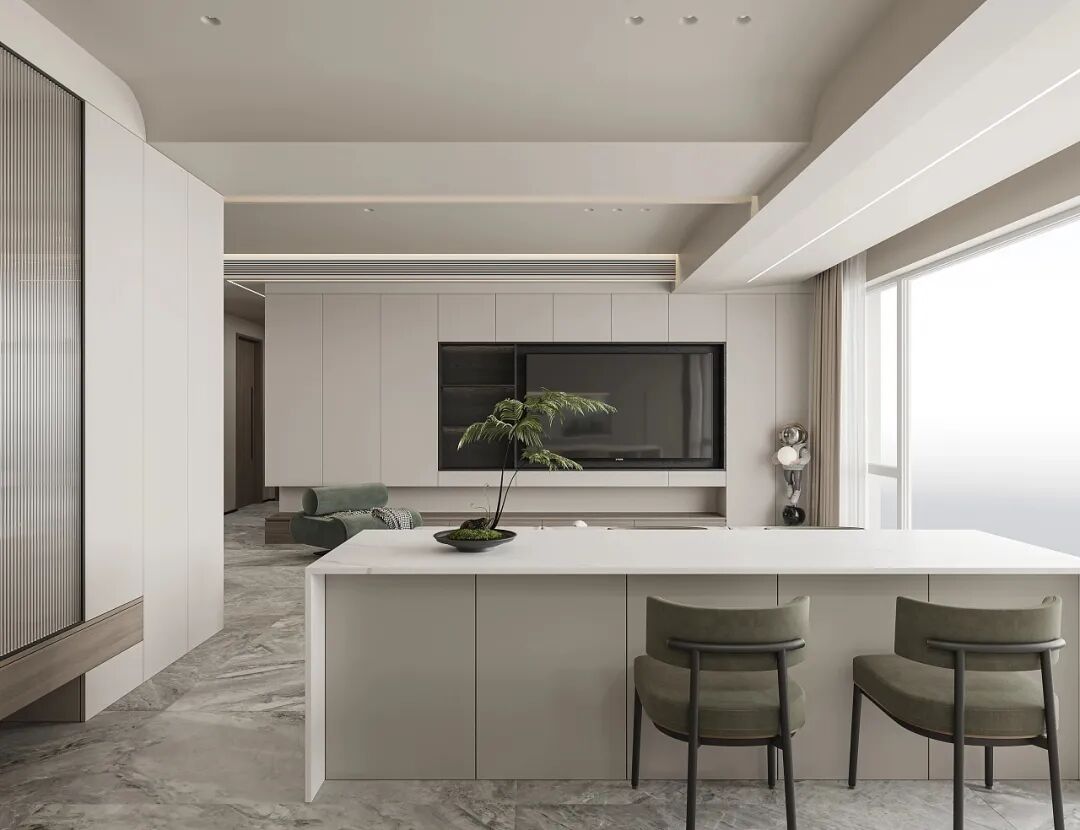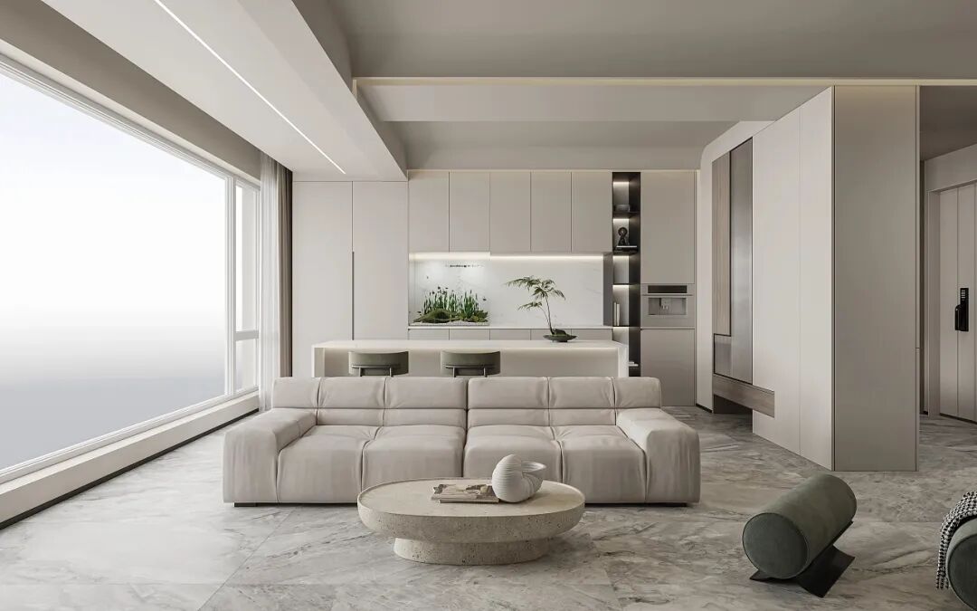 这个极简主义的空间将白色、米色、灰色和灰褐色结合在一起,营造出超现代的外观。光线充足的阳台为家庭带来足够的照度,天花板线性灯、射灯给空间装饰增添了个性。
