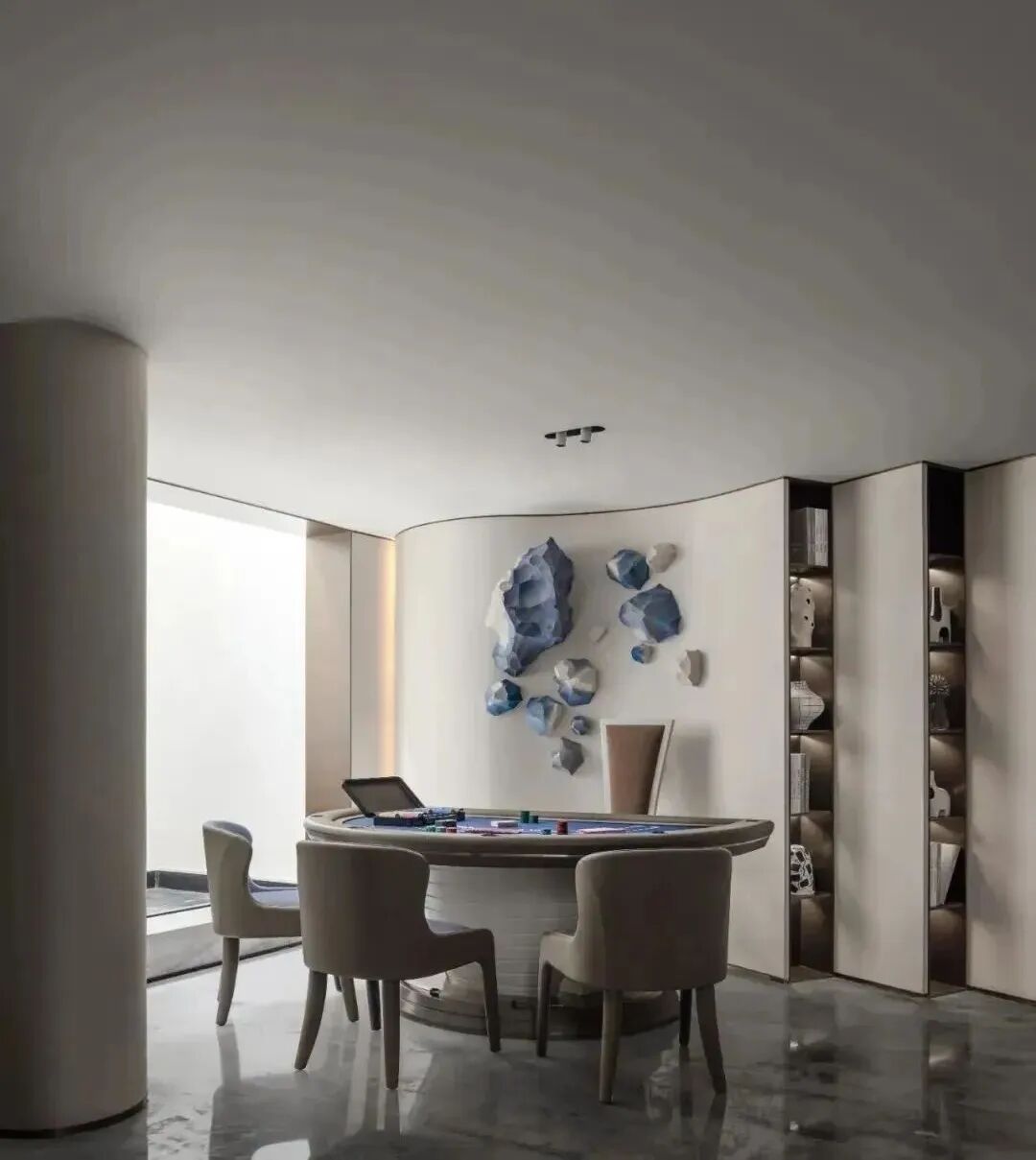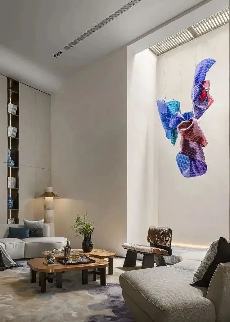 曲线装饰墙镶嵌湖石装置,在光影的作用下,仿佛透过清澈的湖水探到湖底,体块与色彩的互动,室内与室外彼此映照,探索着社交空间的新造型。