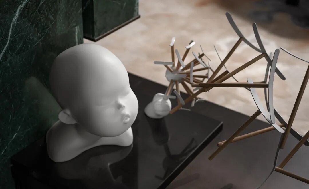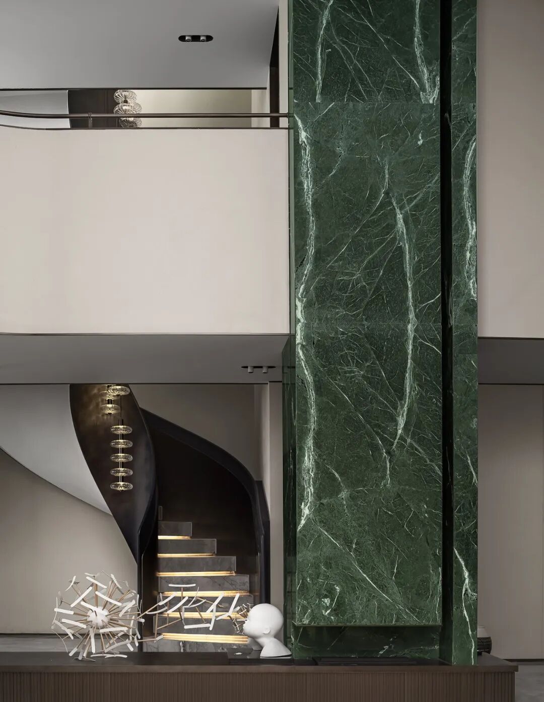 利用不同材质特性营造视觉冲突,以多元的变化视角,在空间中着色流光。旋转楼梯拥抱成鹦鹉螺的形态,白色大理石映衬珍珠般的光泽,水晶灯整齐排列,如深海中悬浮的水母,自由的符号隐晦地在场所中告白。