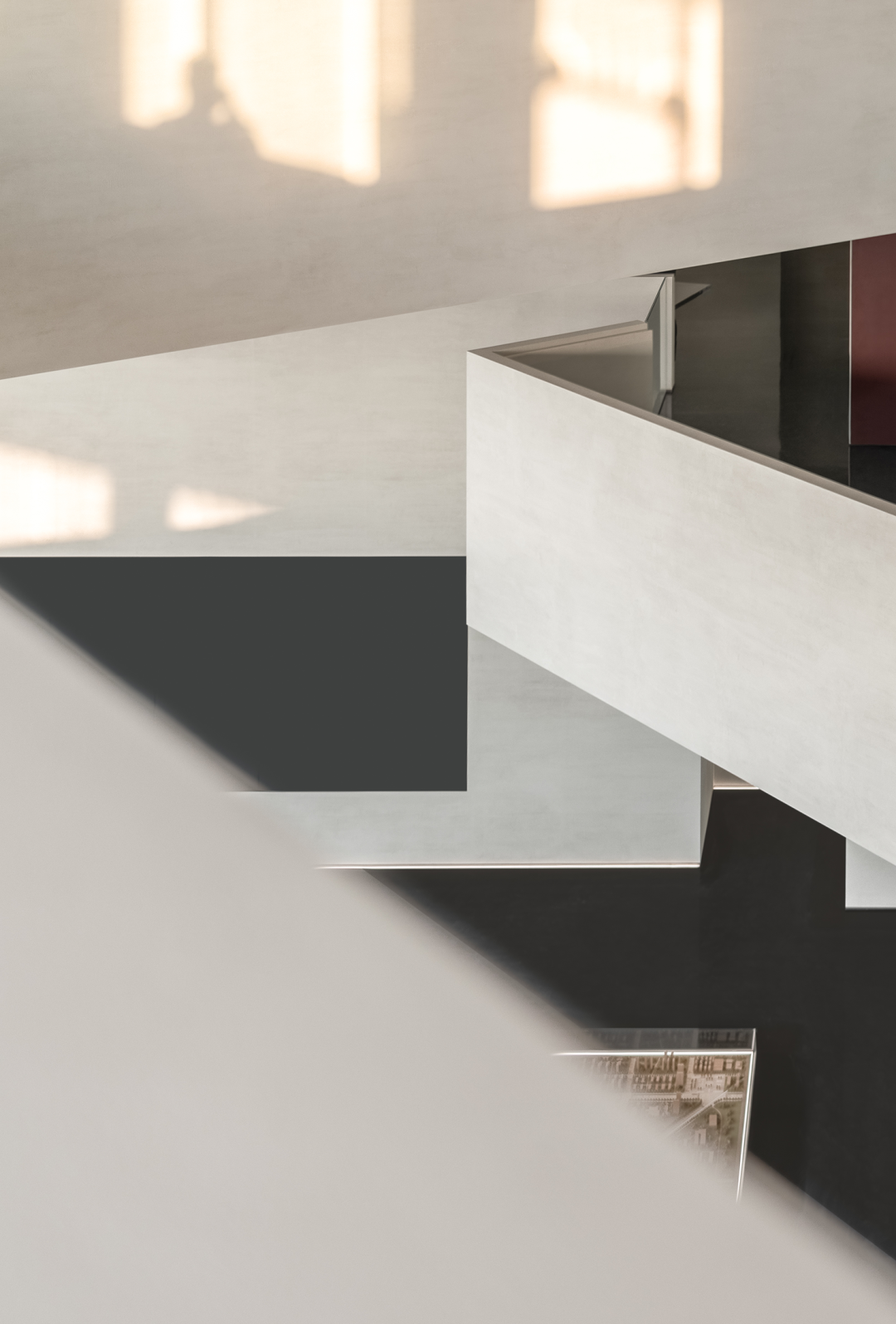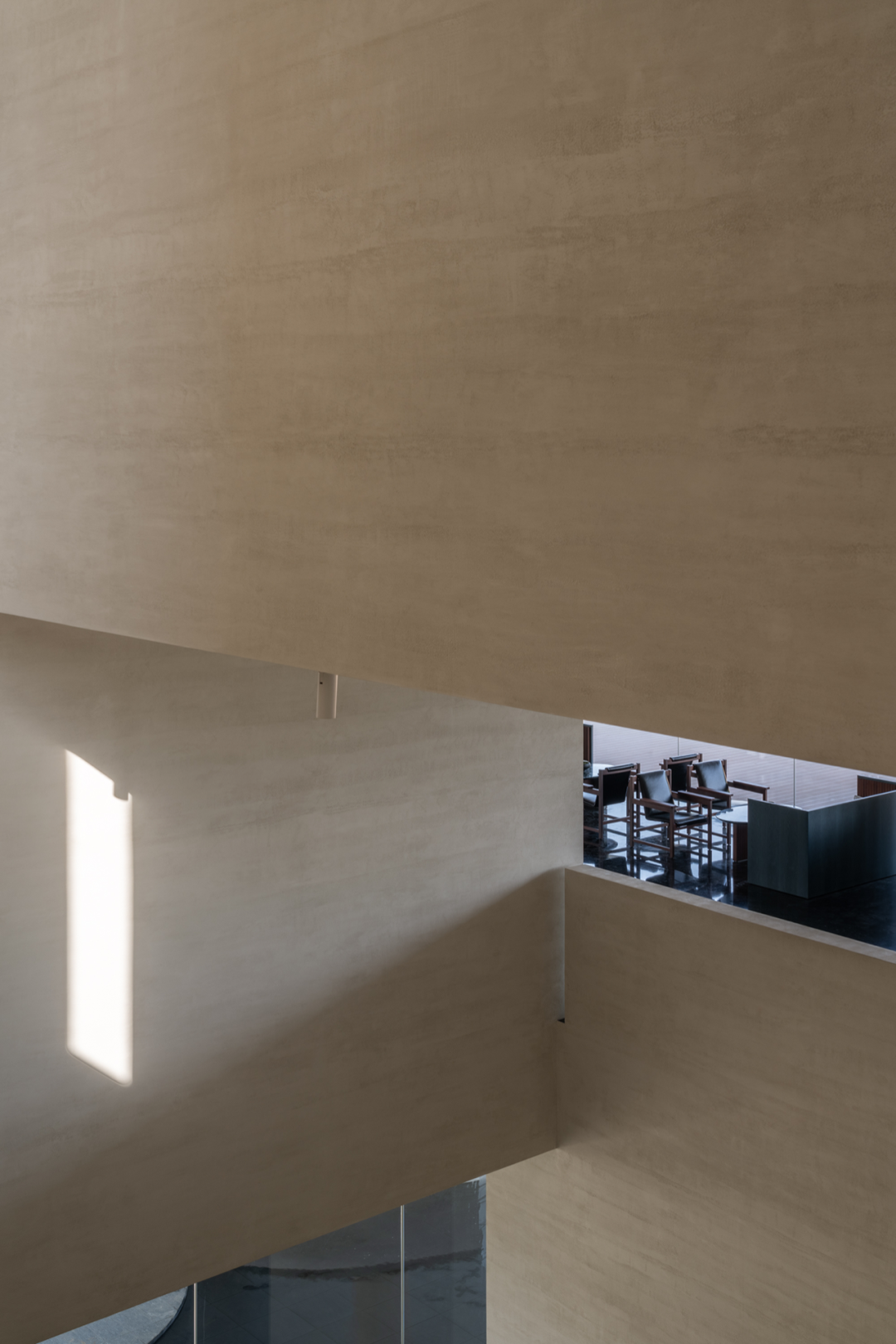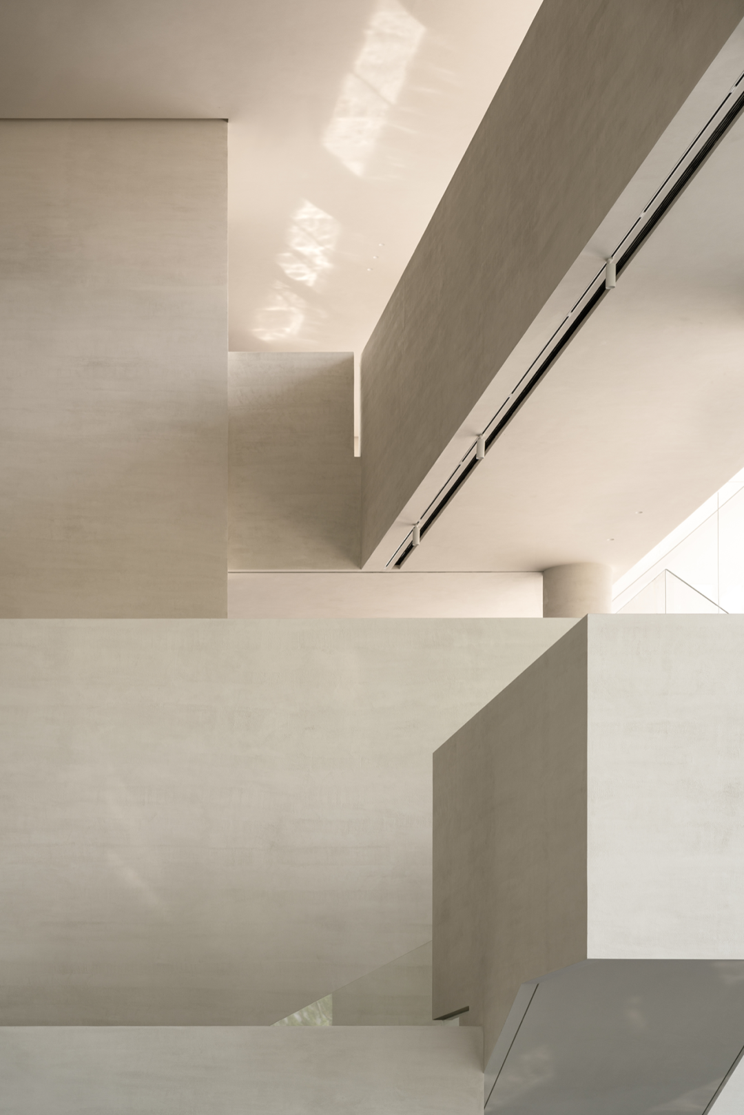 山前一泓深邃平静的氤氲江岸,映照峰林起伏与偶尔掠过鸟飞人影。设计师想像穿梭建筑内部如登山的修习,穿过枝叶相掩、巨石遮天的隧道或于崖下仰眺山峰高耸,感受个人心境转折及不执着物象的澹然。