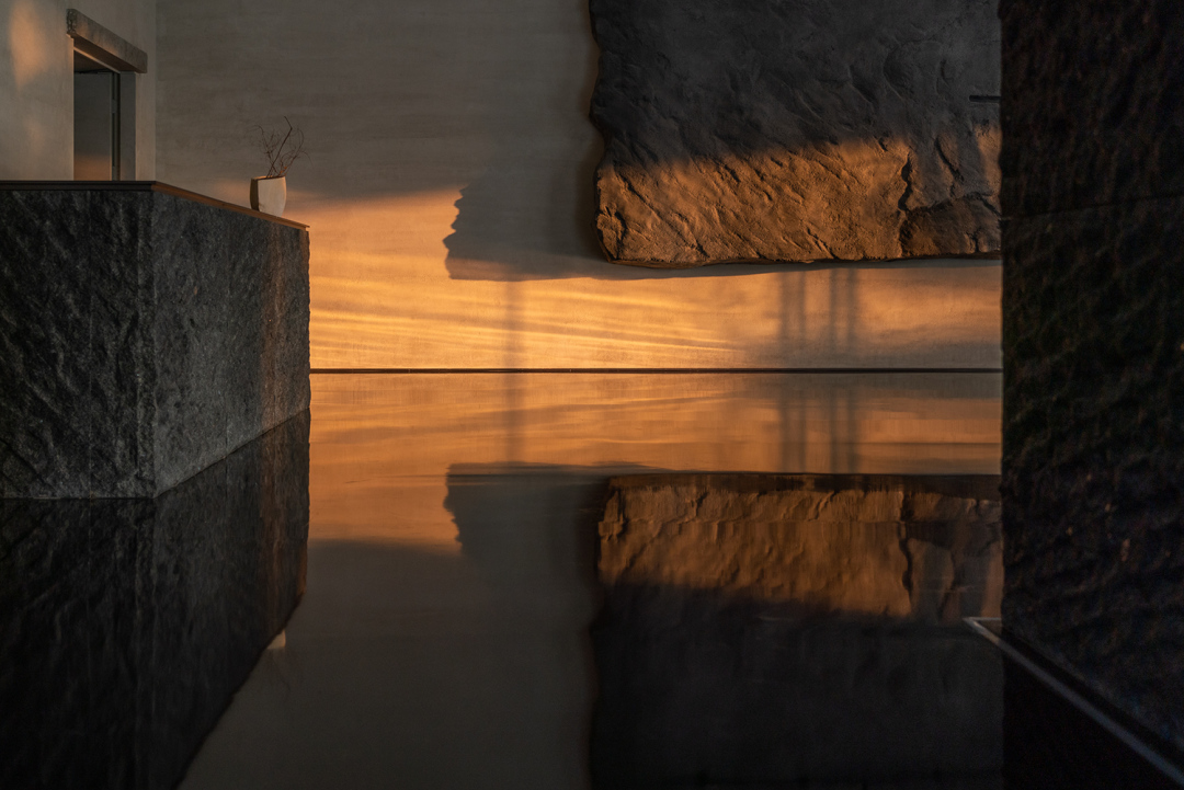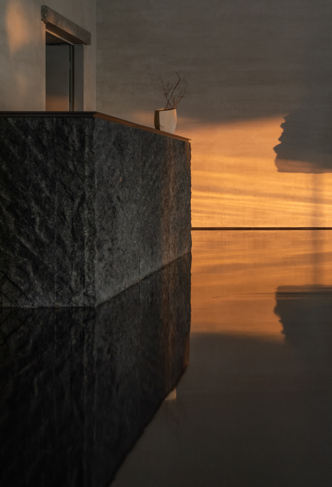 设计师以此为灵感,入口以原石切砌山谷纵深,柜台深凿石面不仅作为建筑立面,亦为山壁写意陈列,将自然奇石姿态化为体验自然的情绪转折;