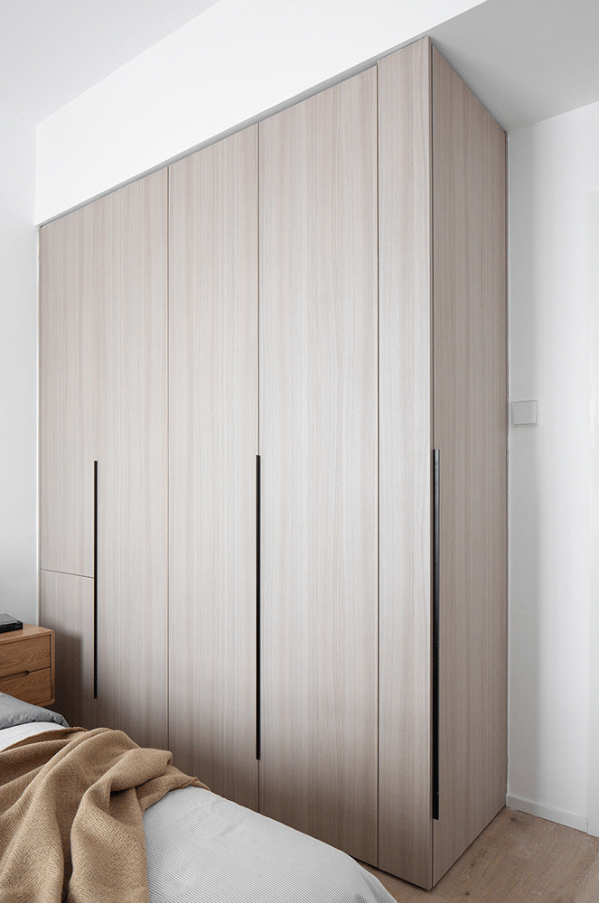 ▲ 主卧是父母住的房间,床尾定制储物卡座,墙上的简易悬挂衣架可以收纳过夜衣物