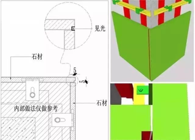 以上随意一款台面石材的阳角收口方法都能很好的躲避掉直接45°收口的危害,而这些石材阳角的收口方法,由于常用于横向的石材结构中,所以,又被我称为