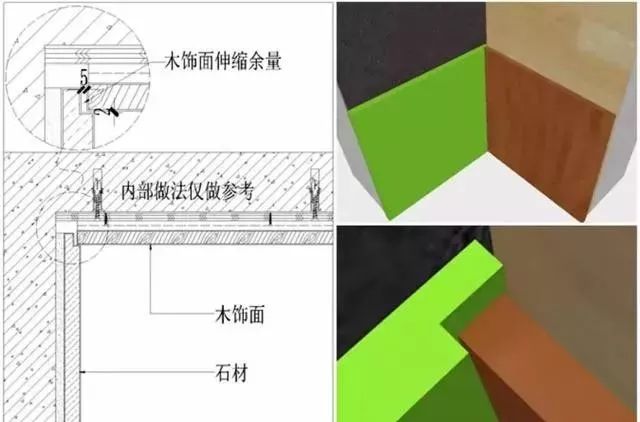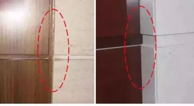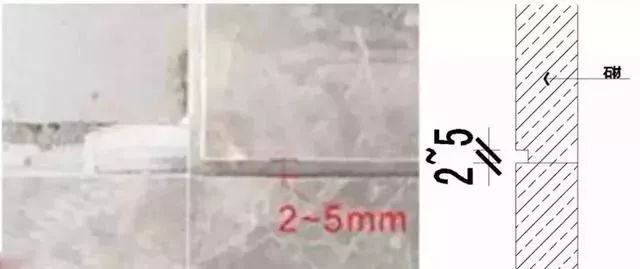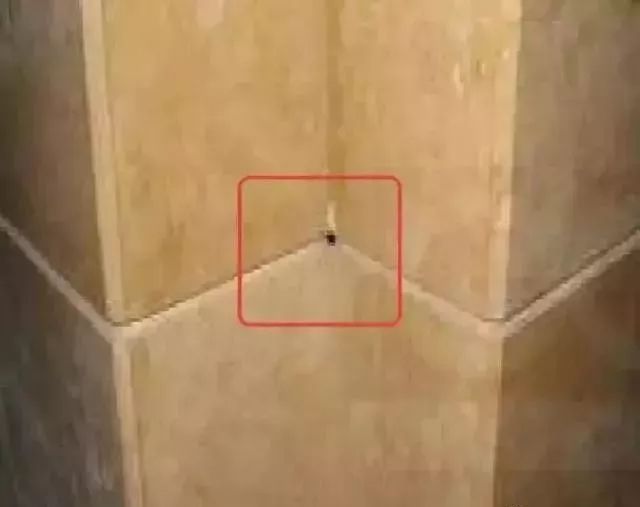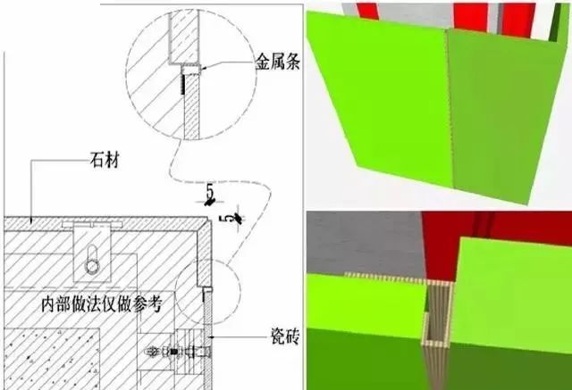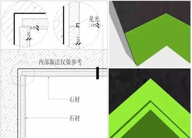 这里需强调一个要点,当石材墙面采用U字缝的方式收口时,由于两边都有缝隙,就会在阴角处呈现下图这样有空隙的收口缺陷。所以,为了避免这个问题,碰到这种情况的墙面构造时,应当做以下形式深化处理。