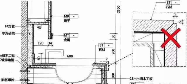 △洗面台采用海棠角的做法上图就是典型的石材收口错误。在石材台面应用这样收口除了影响美观、会刮伤人外,更重要的是后期保洁和维护时将十分费事,时间长了,收口槽内会滋生各种各样的细菌,非常不卫生。
