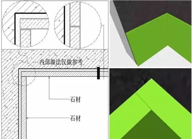 石材与石材的阴角收口相对于阳角而言,其方式要略微单逐个些,主要有以下2种收口方式: