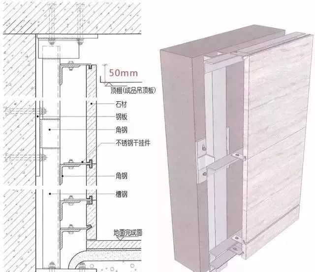 △石材粘贴时,与吊顶的常规收口方式墙面石材与天花吊顶的收口,为了节约本钱,墙面石材通常状况下,采用干挂时,会做到比吊顶位高50mm。采用粘贴时,会用吊顶位来压石材的做法也较为常见。就如下图所示: