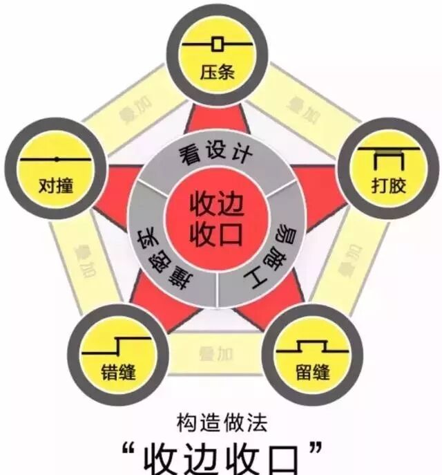 △对撞与错缝在不同材料收口间的应用由于不同材料的韧性,延展性,防湿性等性能均不同,所以,不同材料之间,不建议使用对撞(密缝)的方法来收口。下面请你使用“收边收口”这个工具,以及依据我们提到的所有收口原则,来对下面这些收口方式进行理解与记忆。