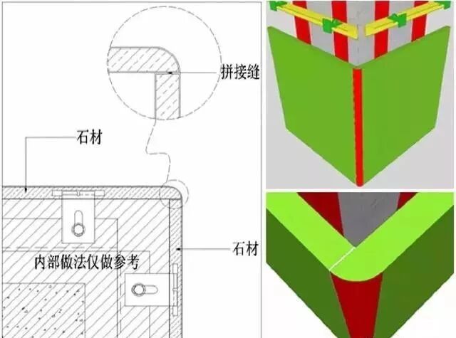 说明:图中绿色为石材,石材上的红色区域为见光面,需要做外表处置;白色缝隙为填缝剂,多数状况下运用接近色填缝;颜色越深的石材此处越不明显。