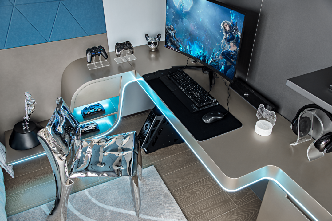电竞房也是整个空间中的重点打造区域,不同层次的灰蓝色调,介入电光蓝的线条元素,科技感沉浸体验被瞬间拉满。