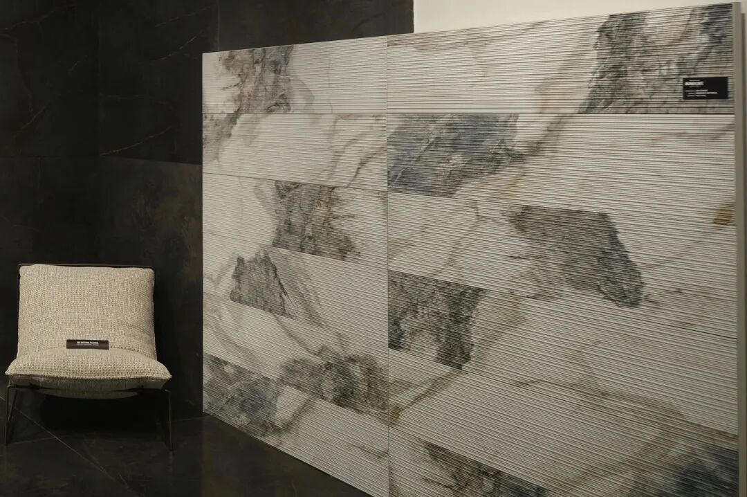 2022博洛尼亚展上就展示了以多种材质为灵感来源的瓷砖产品,除了石纹、木纹等常见纹理外,还出现了墙纸、砂砾、布纹、地毯、水彩画等效果。