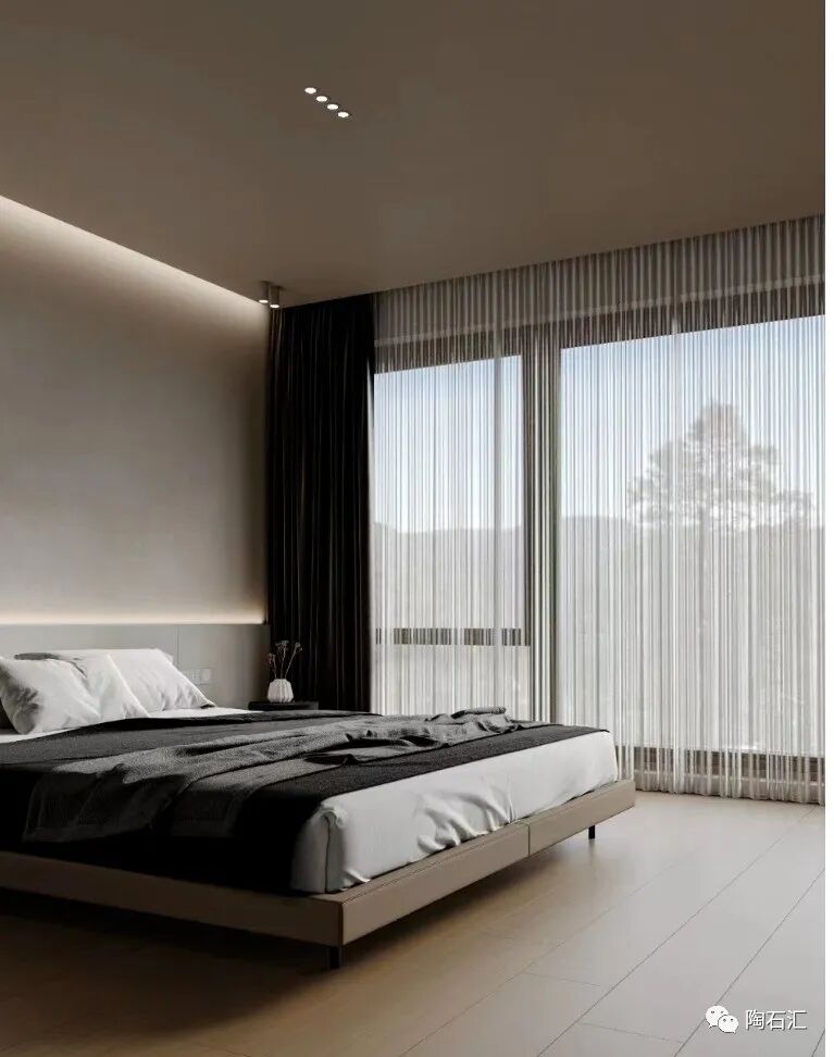 卧室可以选择木纹砖,外观与木地板一样,无需特别打理,使用寿命长,防水防火硬度高。看上去非常简约高级。