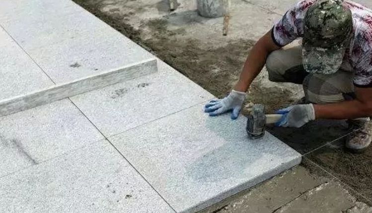 易碎的大理石铺装时,应先找一块同等尺寸的花岗岩板材,放在水泥沙浆铺成的找平层上,敲击、找平。再将大理石板材背面涂刷上水泥浆,轻微敲击、固定。