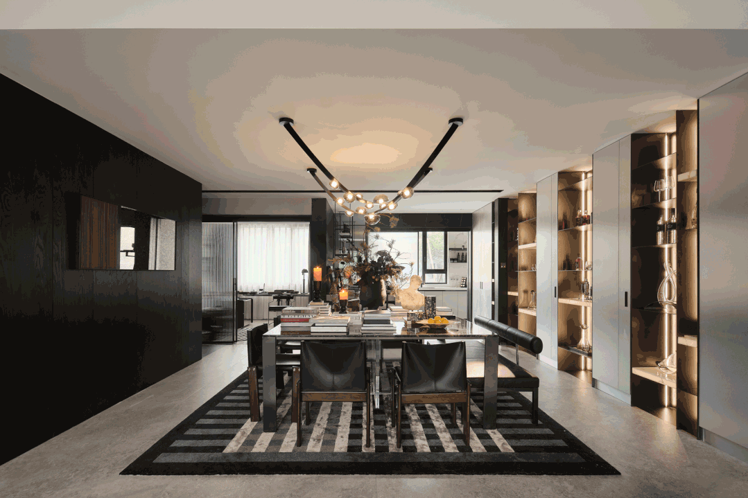 简约几何形态的软装搭配,以温润的皮质感作为基底,与木、石材结构特性相互对比,描绘出空间摩登的气息。