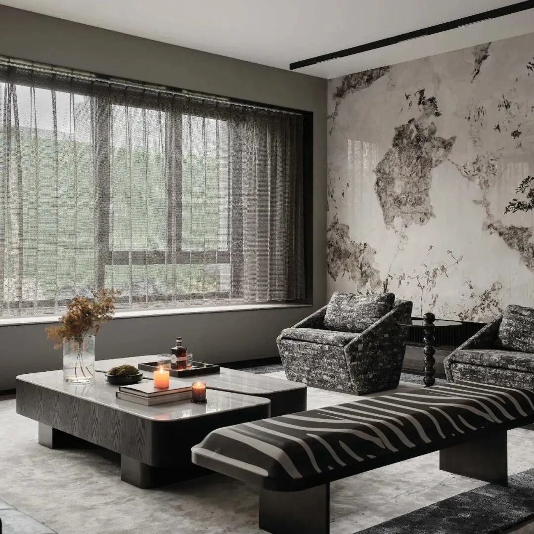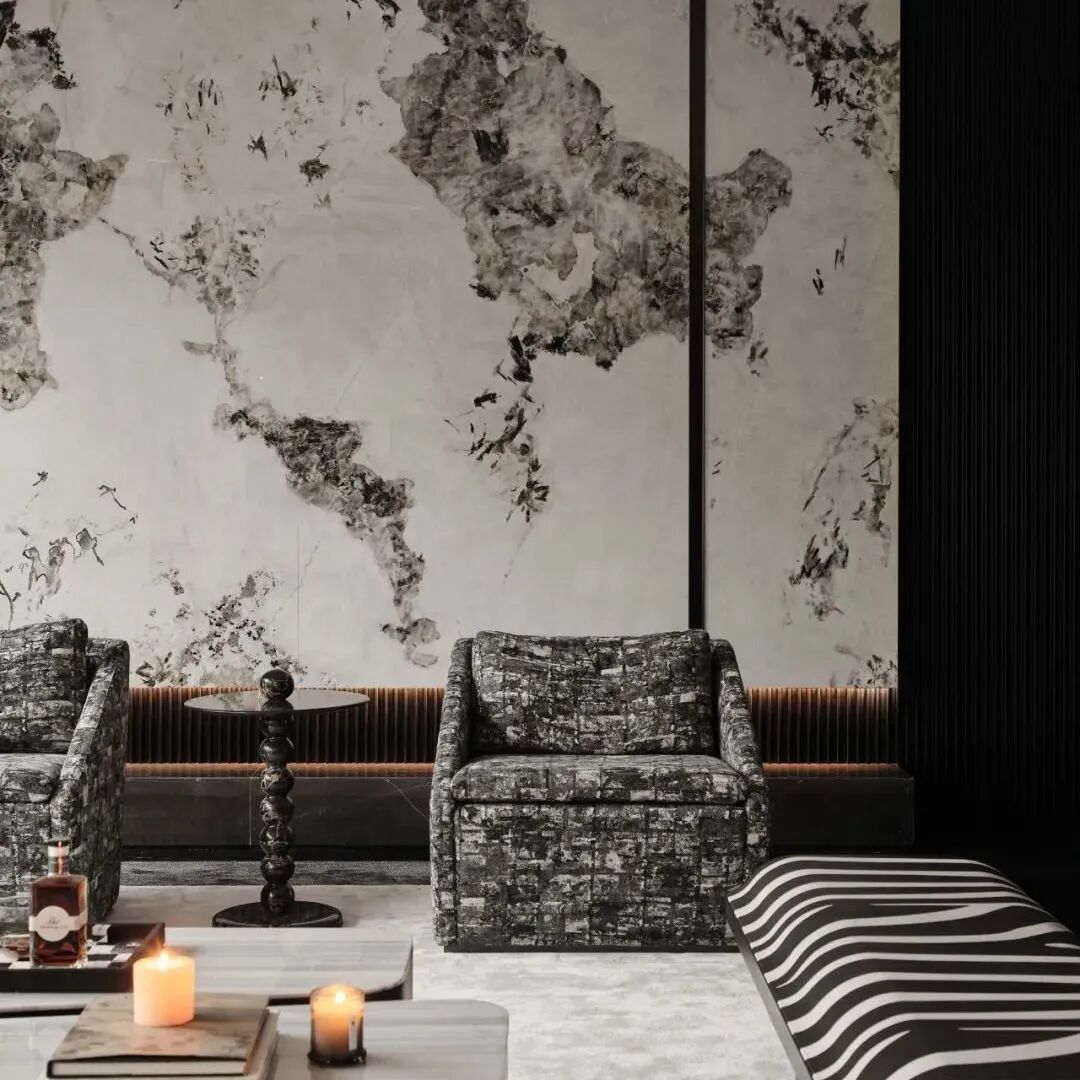 客厅大面积的大理石墙面与量体形式书柜对望相对,形成和谐自然的材料,肌理对比。