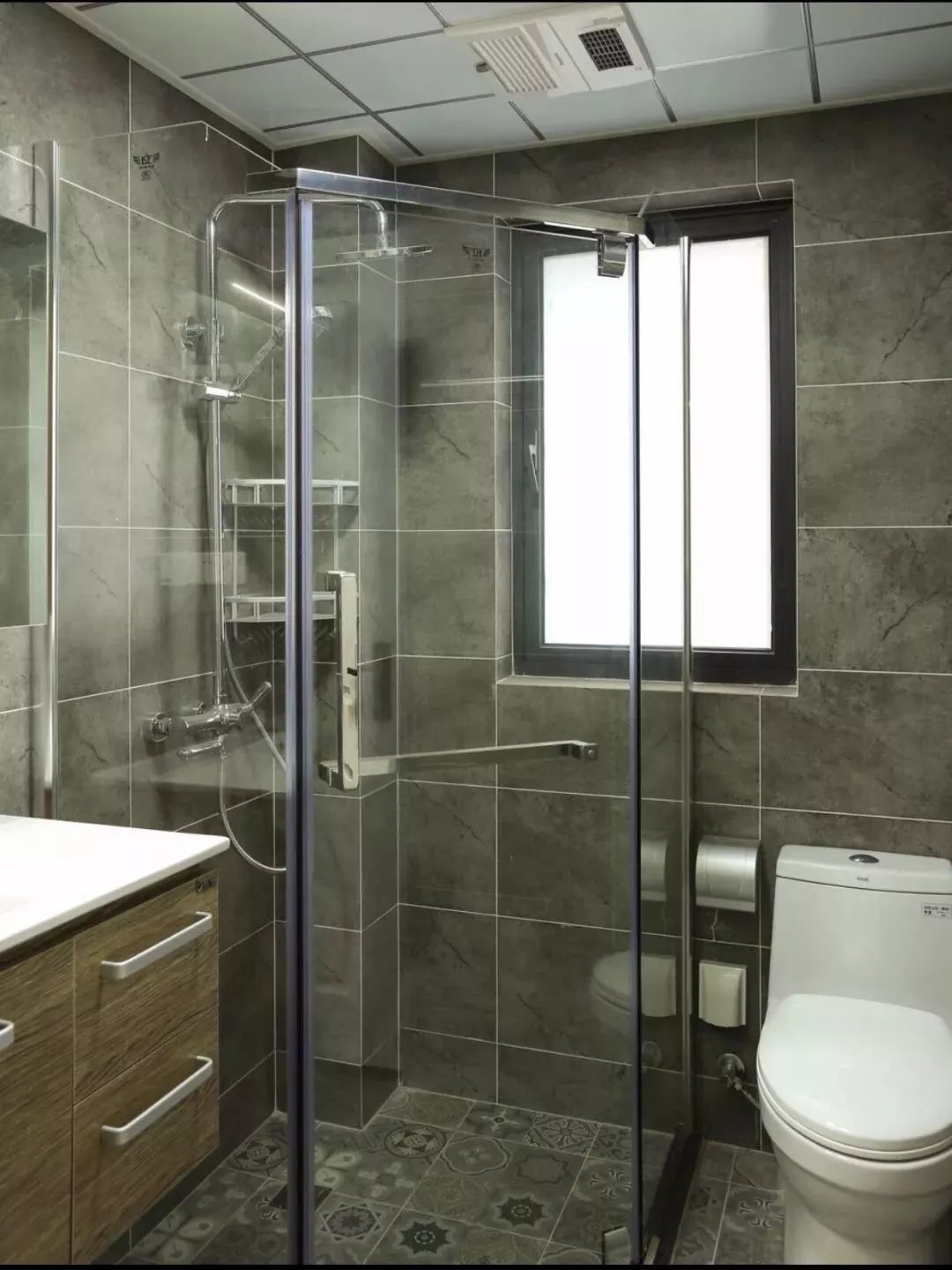 整个卫生间只有3平米左右的,小编觉得还是不要做干湿分离为好,把淋浴放在马桶的边上,每次洗完澡记得拖下地就好。